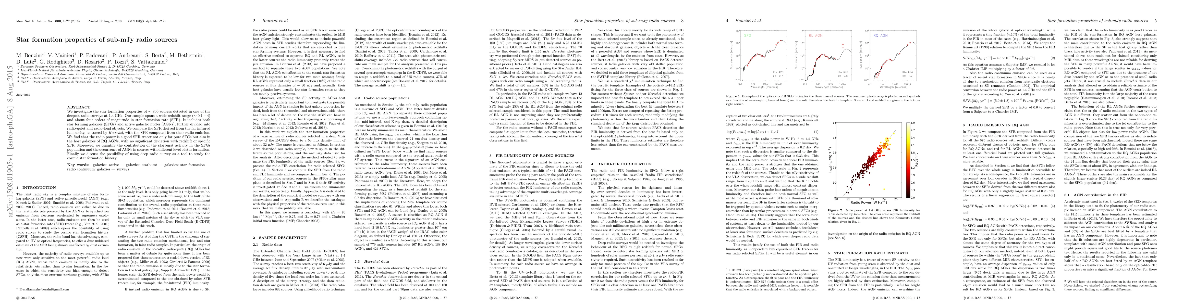 We investigate the star formation properties of ~800 sources detected in one of the deepest radio surveys at 1.4 GHz. Our sample spans a wide redshift range (~0.1 - 4) and about four orders of magnitude in star formation rate (SFR). It includes both star forming galaxies (SFGs) and active galactic nuclei (AGNs), further divided into radio-quiet and radio-loud objects. We compare the SFR derived from the far infrared luminosity, as traced by Herschel, with the SFR computed from their radio emission. We find that the radio power is a good SFR tracer not only for pure SFGs but also in the host galaxies of RQ AGNs, with no significant deviation with redshift or specific SFR. Moreover, we quantify the contribution of the starburst activity in the SFGs population and the occurrence of AGNs in sources with different level of star formation. Finally we discuss the possibility of using deep radio survey as a tool to study the cosmic star formation history.