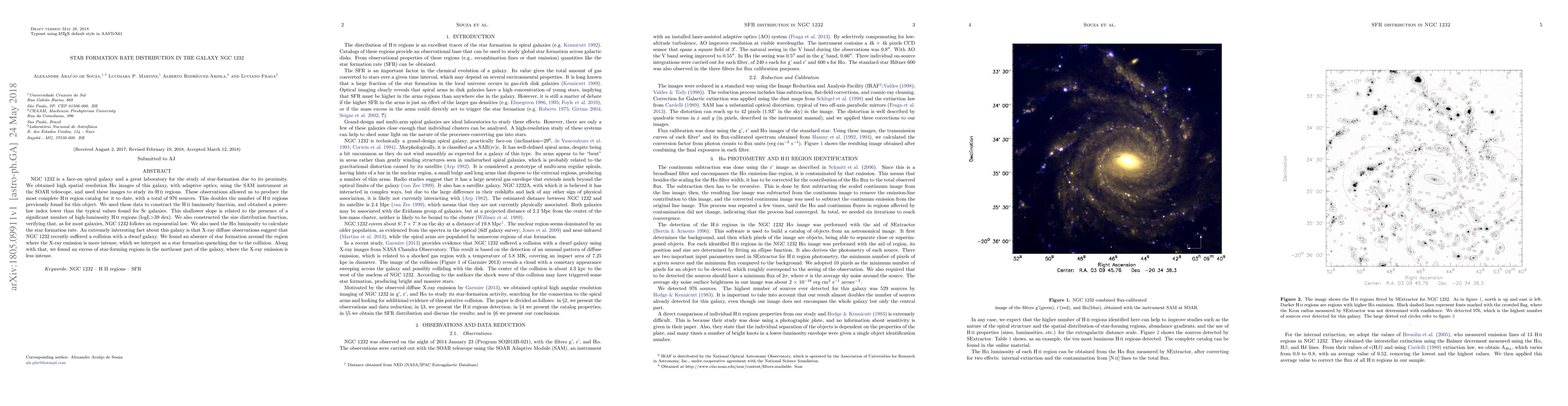 NGC 1232 is a face-on spiral galaxy and a great laboratory for the study of star-formation due to its proximity. We obtained high spatial resolution H{\alpha} images of this galaxy, with adaptive optics, using the SAM instrument at the SOAR telescope, and used these images to study its H ii regions. These observations allowed us to produce the most complete H ii region catalog for it to date, with a total of 976 sources. This doubles the number of H ii regions previously found for this object. We used these data to construct the H ii luminosity function, and obtained a power-law index lower than the typical values found for Sc galaxies. This shallower slope is related to the presence of a significant number of high-luminosity H ii regions (logL>39 dex). We also constructed the size distribution function, verifying that, as for most galaxies, NGC 1232 follows an exponential law. We also used the H{\alpha} luminosity to calculate the star formation rate. An extremely interesting fact about this galaxy is that X-ray diffuse observations suggest that NGC 1232 recently suffered a collision with a dwarf galaxy. We found an absence of star formation around the region where the X-ray emission is more intense, which we interpret as a star formation quenching due to the collision. Along with that, we found an excess of star-forming regions in the northeast part of the galaxy, where the X-ray emission is less intense.