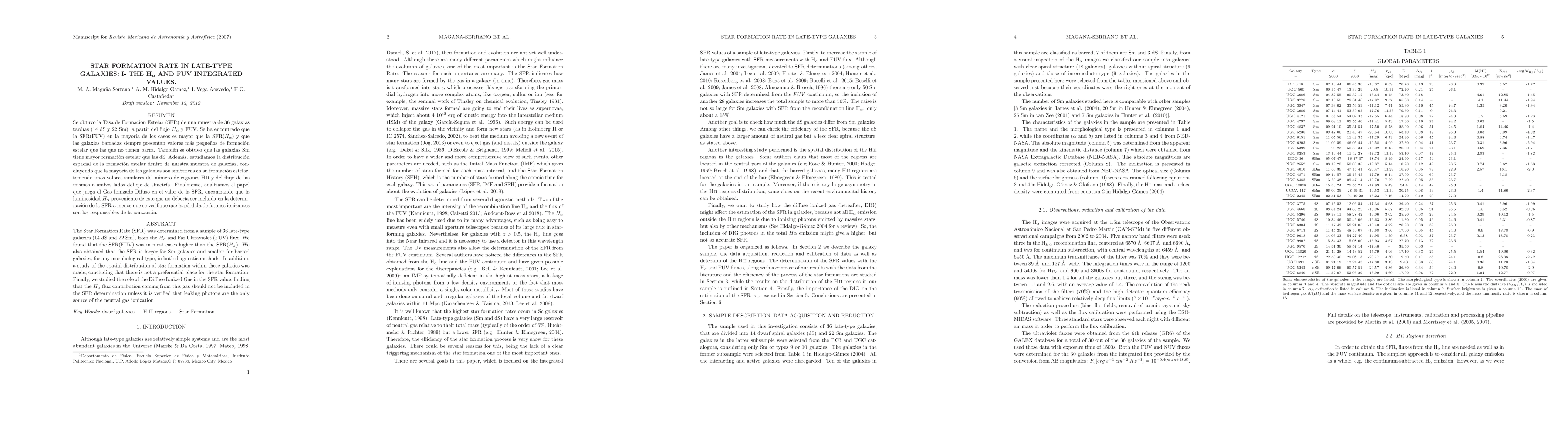 This study measures the Star Formation Rate (SFR) in 36 late-type galaxies using H(alpha) and FUV flux, finding that SFR(FUV) generally exceeds SFR(H(alpha)). It concludes that SFR is higher in Sm galaxies and lower in barred galaxies, regardless of morphology, and that star formation occurs without a preferential spatial distribution.