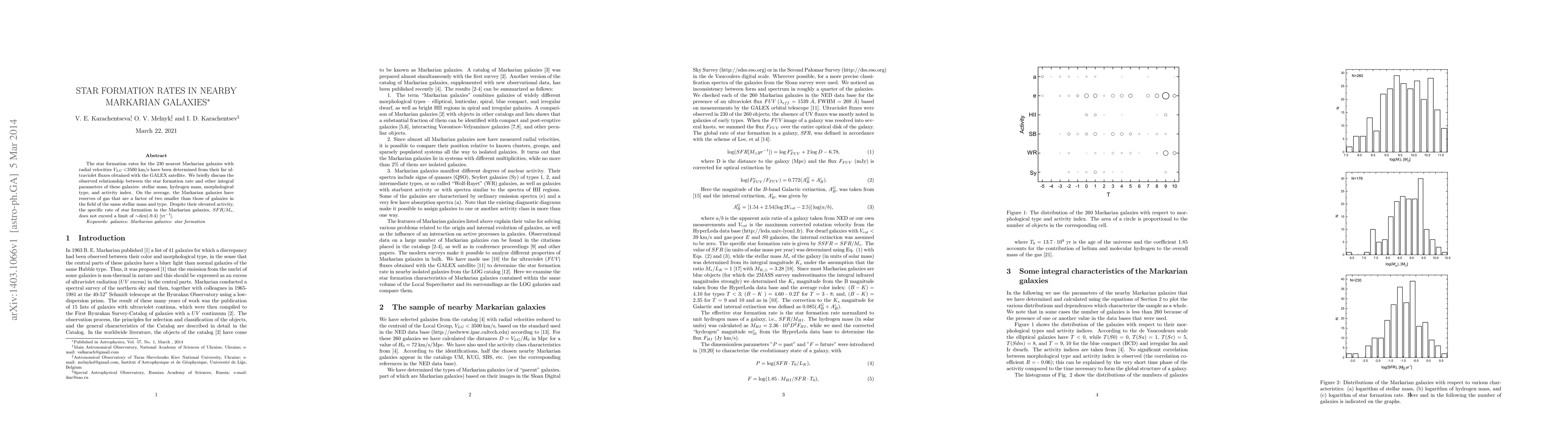 The star formation rates for the 230 nearest Markarian galaxies with radial velocities V_LG<3500 km/s have been determined from their far ultraviolet fluxes obtained with the GALEX satellite. We briefly discuss the observed relationship between the star formation rate and other integral parameters of these galaxies: stellar mass, hydrogen mass, morphological type, and activity index. On the average, the Markarian galaxies have reserves of gas that are a factor of two smaller than those of galaxies in the field of the same stellar mass and type. Despite their elevated activity, the specific rate of star formation in the Markarian galaxies, SFR/M_*, does not exceed a limit of ~dex(-9.4) [yr^-1].