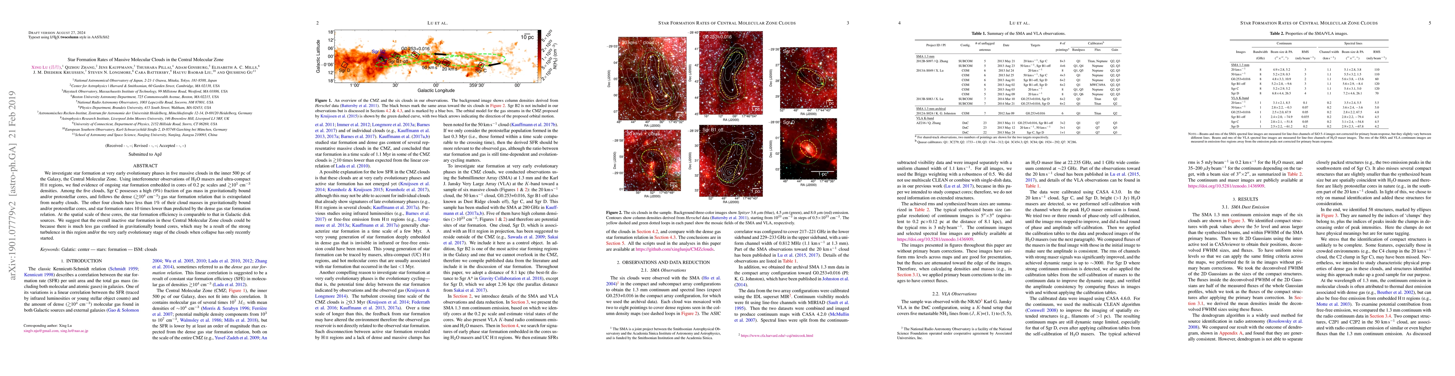 This study investigates star formation in five massive molecular clouds within the Central Molecular Zone of the Galaxy, finding evidence of active star formation in the cloud Sgr C, while the other four clouds show much lower star formation rates likely due to less gas in gravitationally bound cores, possibly influenced by turbulence or early evolutionary stages.