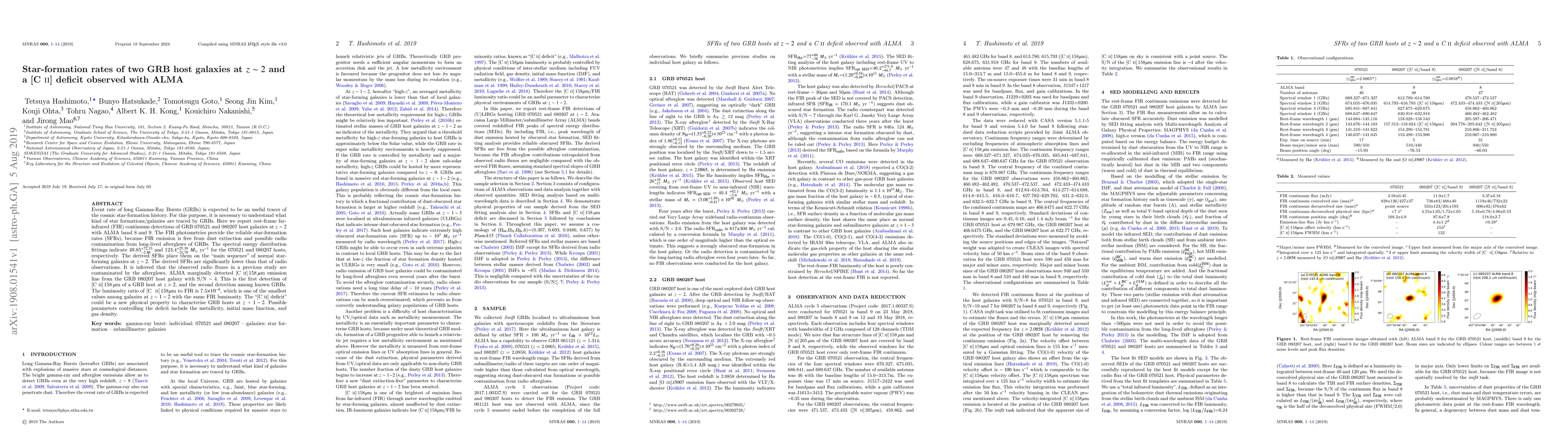 This paper reports ALMA observations of two GRB host galaxies at $z\sim2$, revealing high star-formation rates consistent with the main sequence of normal star-forming galaxies. It also detects a [CII] deficit in one host, suggesting unique physical properties potentially linked to metallicity, initial mass function, and gas density.