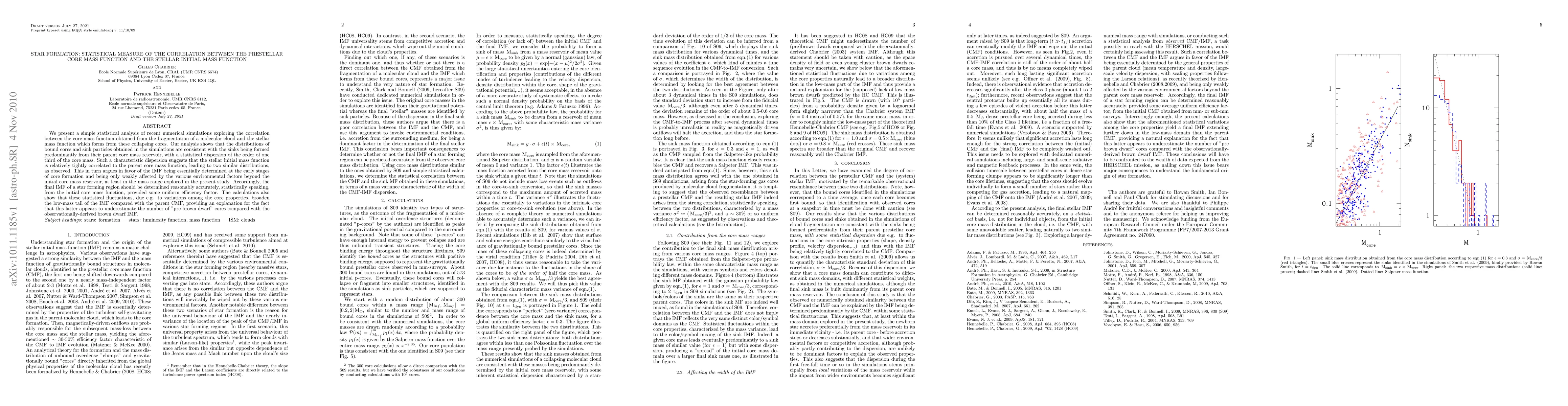 We present a simple statistical analysis of recent numerical simulations exploring the correlation between the core mass function obtained from the fragmentation of a molecular cloud and the stellar mass function which forms from these collapsing cores. Our analysis shows that the distributions of bound cores and sink particles obtained in the simulations are consistent with the sinks being formed predominantly from their parent core mass reservoir, with a statistical dispersion of the order of one third of the core mass. Such a characteristic dispersion suggests that the stellar initial mass function is relatively tightly correlated to the parent core mass function, leading to two similar distributions, as observed. This in turn argues in favor of the IMF being essentially determined at the early stages of core formation and being only weakly affected by the various environmental factors beyond the initial core mass reservoir, at least in the mass range explored in the present study. Accordingly, the final IMF of a star forming region should be determined reasonably accurately, statistically speaking, from the initial core mass function, provided some uniform efficiency factor. The calculations also show that these statistical fluctuations, due e.g. to variations among the core properties, broaden the low-mass tail of the IMF compared with the parent CMF, providing an explanation for the fact that this latter appears to underestimate the number of "pre brown dwarf" cores compared with the observationally-derived brown dwarf IMF.