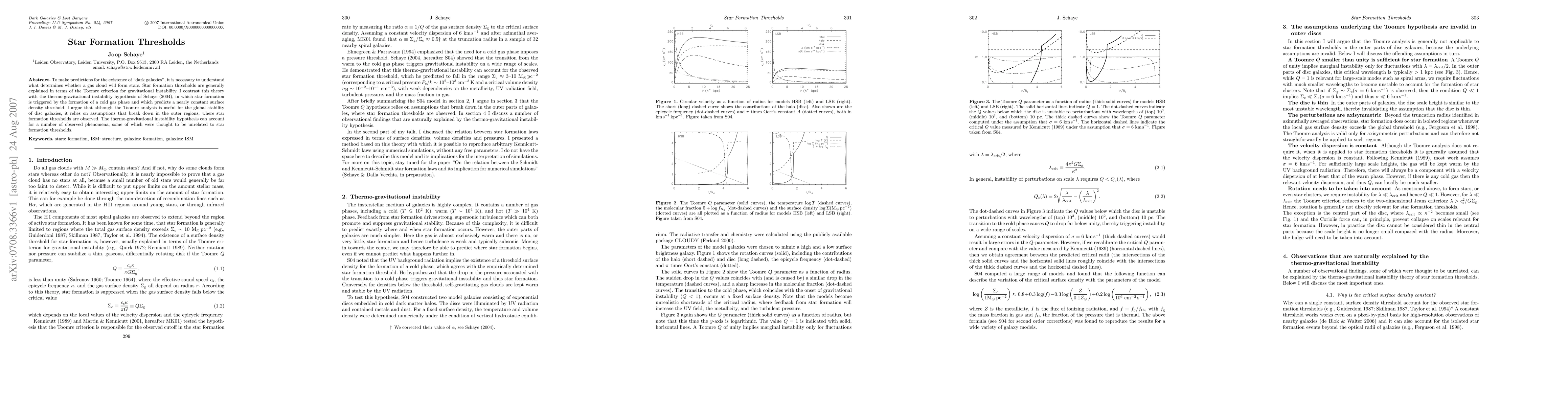 To make predictions for the existence of ``dark galaxies'', it is necessary to understand what determines whether a gas cloud will form stars. Star formation thresholds are generally explained in terms of the Toomre criterion for gravitational instability. I contrast this theory with the thermo-gravitational instability hypothesis of Schaye (2004), in which star formation is triggered by the formation of a cold gas phase and which predicts a nearly constant surface density threshold. I argue that although the Toomre analysis is useful for the global stability of disc galaxies, it relies on assumptions that break down in the outer regions, where star formation thresholds are observed. The thermo-gravitational instability hypothesis can account for a number of observed phenomena, some of which were thought to be unrelated to star formation thresholds.