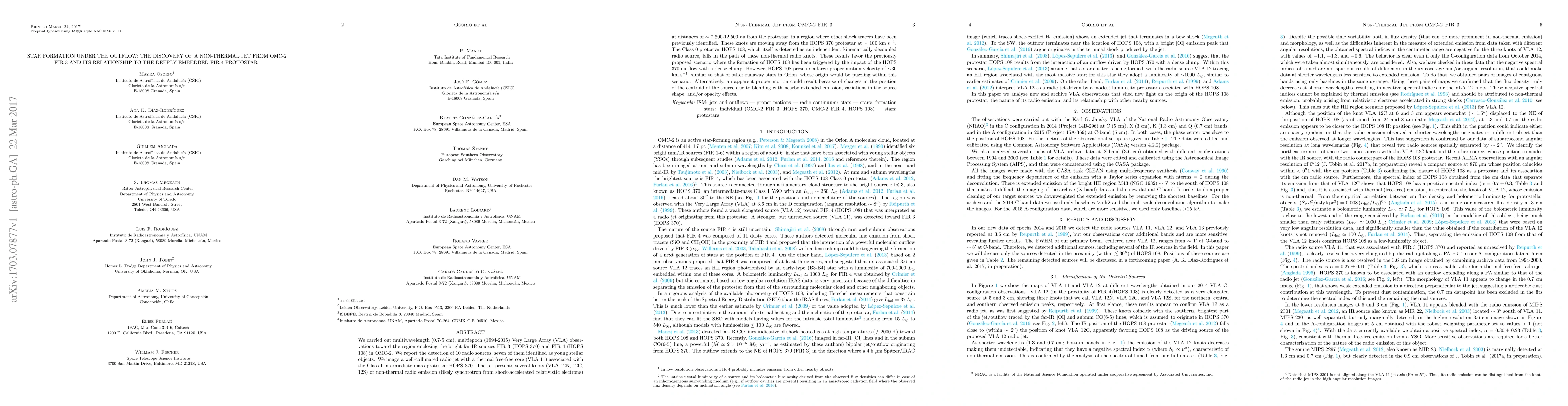 We carried out multiwavelength (0.7-5 cm), multiepoch (1994-2015) Very Large Array (VLA) observations toward the region enclosing the bright far-IR sources FIR 3 (HOPS 370) and FIR 4 (HOPS 108) in OMC-2. We report the detection of 10 radio sources, seven of them identified as young stellar objects. We image a well-collimated radio jet with a thermal free-free core (VLA 11) associated with the Class I intermediate-mass protostar HOPS 370. The jet presents several knots (VLA 12N, 12C, 12S) of non-thermal radio emission (likely synchrotron from shock-accelerated relativistic electrons) at distances of ~7,500-12,500 au from the protostar, in a region where other shock tracers have been previously identified. These knots are moving away from the HOPS 370 protostar at ~ 100 km/s. The Class 0 protostar HOPS 108, which itself is detected as an independent, kinematically decoupled radio source, falls in the path of these non-thermal radio knots. These results favor the previously proposed scenario where the formation of HOPS 108 has been triggered by the impact of the HOPS 370 outflow with a dense clump. However, HOPS 108 presents a large proper motion velocity of ~ 30 km/s, similar to that of other runaway stars in Orion, whose origin would be puzzling within this scenario. Alternatively, an apparent proper motion could result because of changes in the position of the centroid of the source due to blending with nearby extended emission, variations in the source shape, and /or opacity effects.
