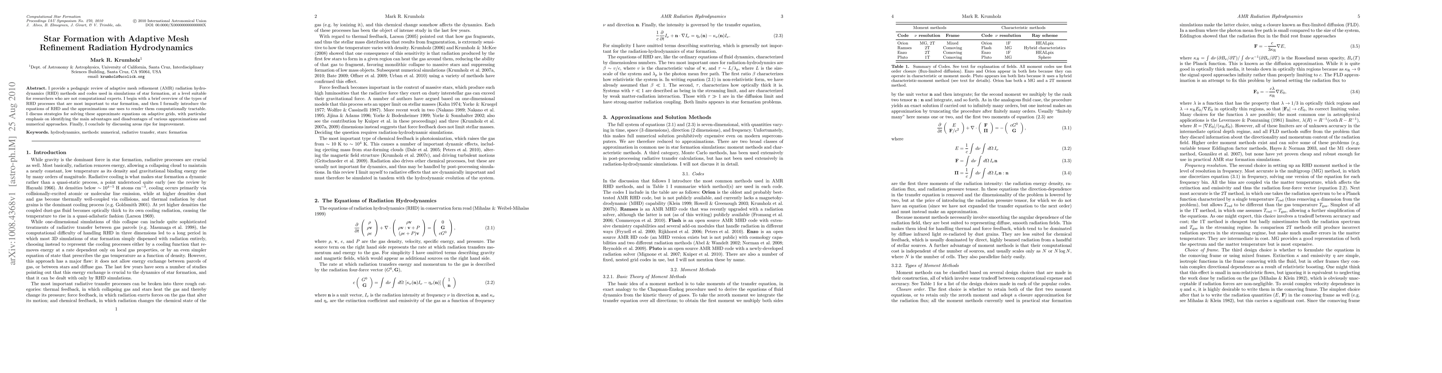 I provide a pedagogic review of adaptive mesh refinement (AMR) radiation hydrodynamics (RHD) methods and codes used in simulations of star formation, at a level suitable for researchers who are not computational experts. I begin with a brief overview of the types of RHD processes that are most important to star formation, and then I formally introduce the equations of RHD and the approximations one uses to render them computationally tractable. I discuss strategies for solving these approximate equations on adaptive grids, with particular emphasis on identifying the main advantages and disadvantages of various approximations and numerical approaches. Finally, I conclude by discussing areas ripe for improvement.