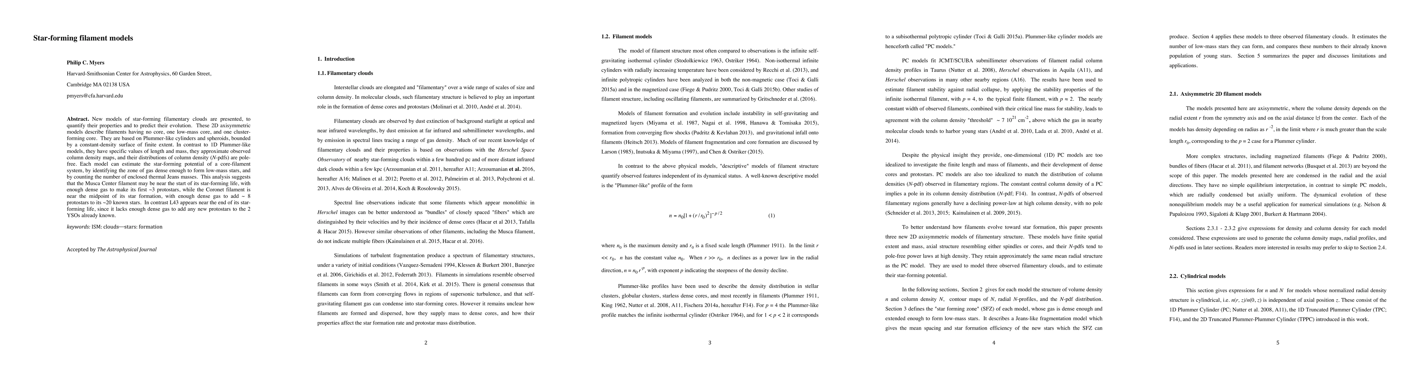 This paper introduces new 2D axisymmetric models of star-forming filaments to quantify their properties and predict evolution, identifying zones of dense gas capable of forming low-mass stars. The analysis suggests the Musca Center filament is initiating star formation, while the Coronet filament is mid-way, and L43 is nearing the end of its star-forming phase.