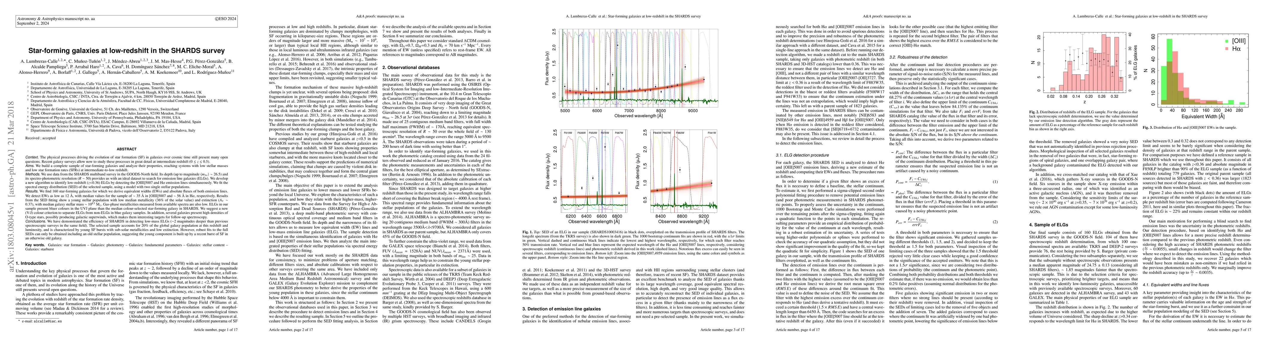 This study uses the SHARDS survey to identify and analyze low-redshift star-forming galaxies, finding 160 such galaxies with low stellar masses and star formation rates. The research reveals young stellar populations with low metallicity and extinction, suggesting recent star formation bursts in otherwise old galaxies.