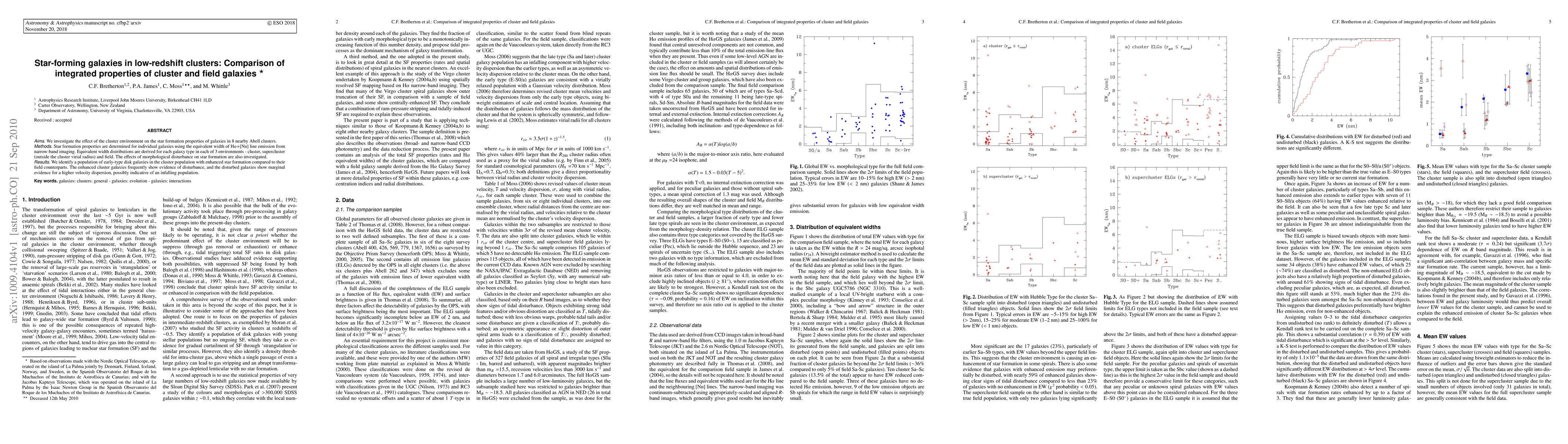 We investigate the effect of the cluster environment on the star formation properties of galaxies in 8 nearby Abell clusters. Star formation properties are determined for individual galaxies using the equivalent width of H alpha plus [NII] line emission from narrow-band imaging. Equivalent width distributions are derived for each galaxy type in each of 3 environments - cluster, supercluster (outside the cluster virial radius) and field. The effects of morphological disturbance on star formation are also investigated. We identify a population of early-type disk galaxies in the cluster population with enhanced star formation compared to their field counterparts. The enhanced cluster galaxies frequently show evidence of disturbance, and the disturbed galaxies show marginal evidence for a higher velocity dispersion, possibly indicative of an infalling population.