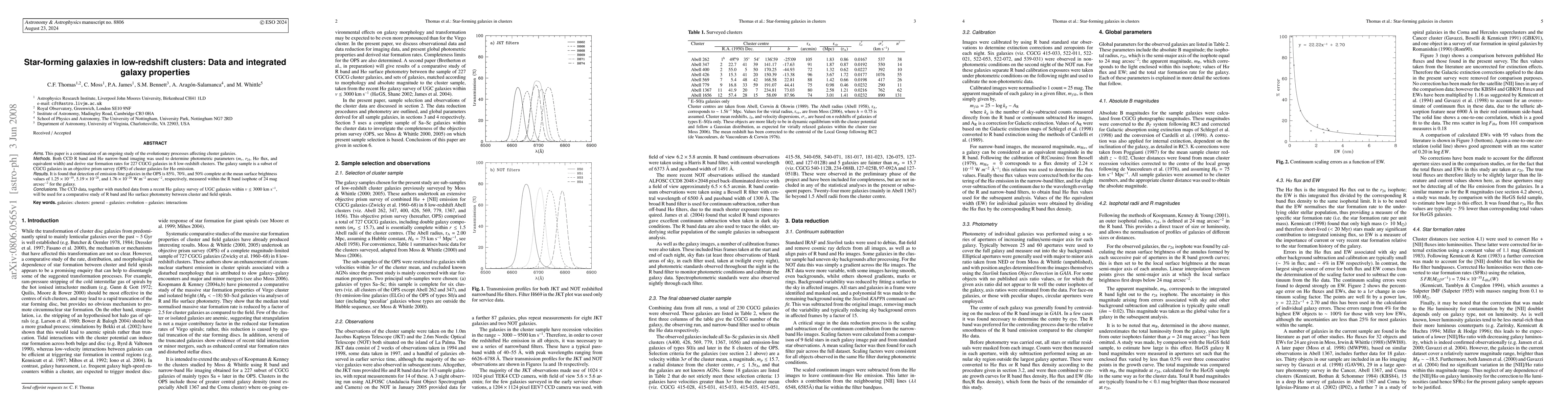 This study examines 227 CGCG galaxies in 8 low-redshift clusters using CCD R band and H alpha narrow-band imaging to measure photometric parameters and derive star formation rates. It finds 85%, 70%, and 50% completeness for emission-line galaxy detection at specific mean surface brightness values. The data will be used for a comparative study of R band and H alpha surface photometry between cluster and field spirals.