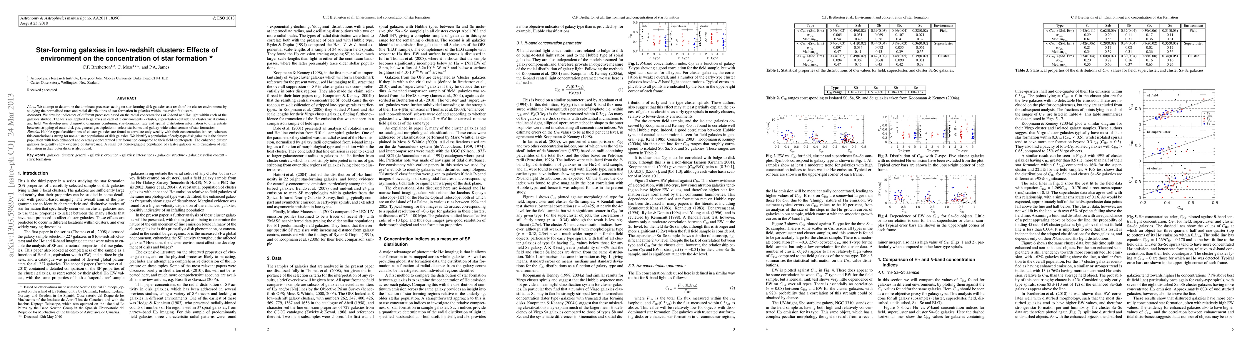 We attempt to determine the dominant processes acting on star-forming disk galaxies as a result of the cluster environment by studying the normalised rates and radial distributions of star formation in galaxies within low-redshift clusters. We develop indicators of different processes based on the radial concentrations of R-band and H alpha light within each of the galaxies studied. The tests are applied to galaxies in each of 3 environments - cluster, supercluster (outside the cluster virial radius) and field. We develop new diagnostic diagrams combining star-formation rate and spatial distribution information to differentiate between stripping of outer disk gas, general gas depletion, nuclear starbursts and galaxy-wide enhancement of star formation. Hubble type classifications of cluster galaxies are found to correlate only weakly with their concentration indices, whereas this correlation is strong for non-cluster populations of disk galaxies. We identify a population of early-type disk galaxies in the cluster population with both enhanced and centrally-concentrated star formation compared to their field counterparts. The enhanced cluster galaxies frequently show evidence of disturbance. A small but non-negligible population of cluster galaxies with truncation of star formation in their outer disks is also found.