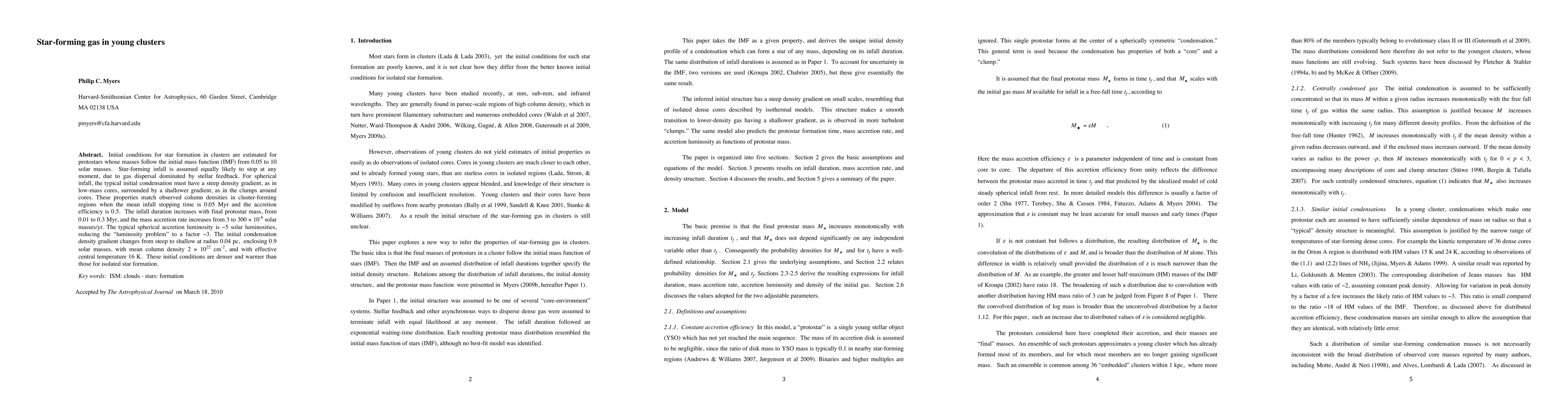 Initial conditions for star formation in clusters are estimated for protostars whose masses follow the initial mass function (IMF) from 0.05 to 10 solar masses. Star-forming infall is assumed equally likely to stop at any moment, due to gas dispersal dominated by stellar feedback. For spherical infall, the typical initial condensation must have a steep density gradient, as in low-mass cores, surrounded by a shallower gradient, as in the clumps around cores. These properties match observed column densities in cluster-forming regions when the mean infall stopping time is 0.05 Myr and the accretion efficiency is 0.5. The infall duration increases with final protostar mass, from 0.01 to 0.3 Myr, and the mass accretion rate increases from 3 to 300 x 10^(-6) solar masses/yr. The typical spherical accretion luminosity is ~5 solar luminosities, reducing the luminosity problem to a factor ~3. The initial condensation density gradient changes from steep to shallow at radius 0.04 pc, enclosing 0.9 solar masses, with mean column density 2 x 10^(22) cm^(-2), and with effective central temperature 16 K. These initial conditions are denser and warmer than those for isolated star formation.
