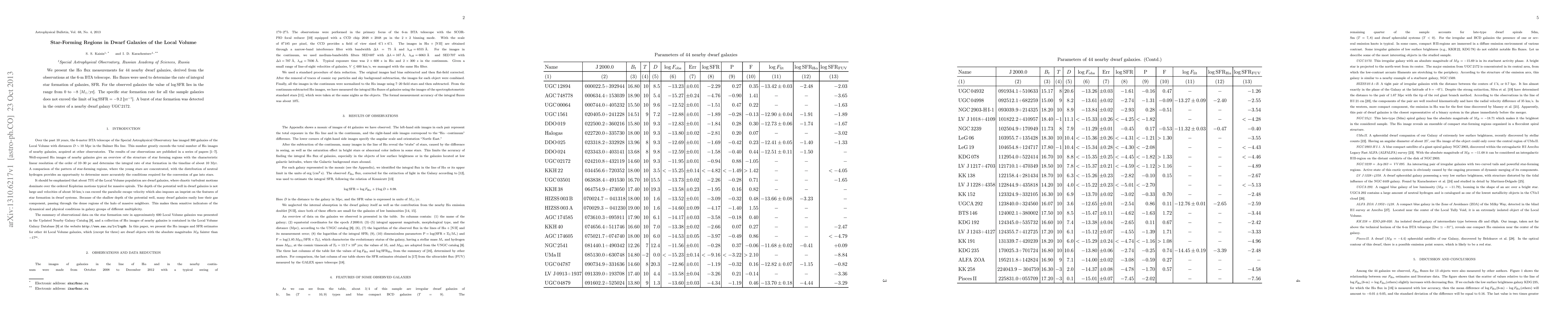 This study measures H-alpha fluxes in 44 nearby dwarf galaxies to determine their star formation rates (SFR), finding values ranging from 0 to -8 M_sun/yr. The specific star formation rate (SSFR) for all galaxies does not exceed log SSFR=-9.2 yr^{-1}, with a notable star formation burst detected in the center of the dwarf galaxy UGC 2172.