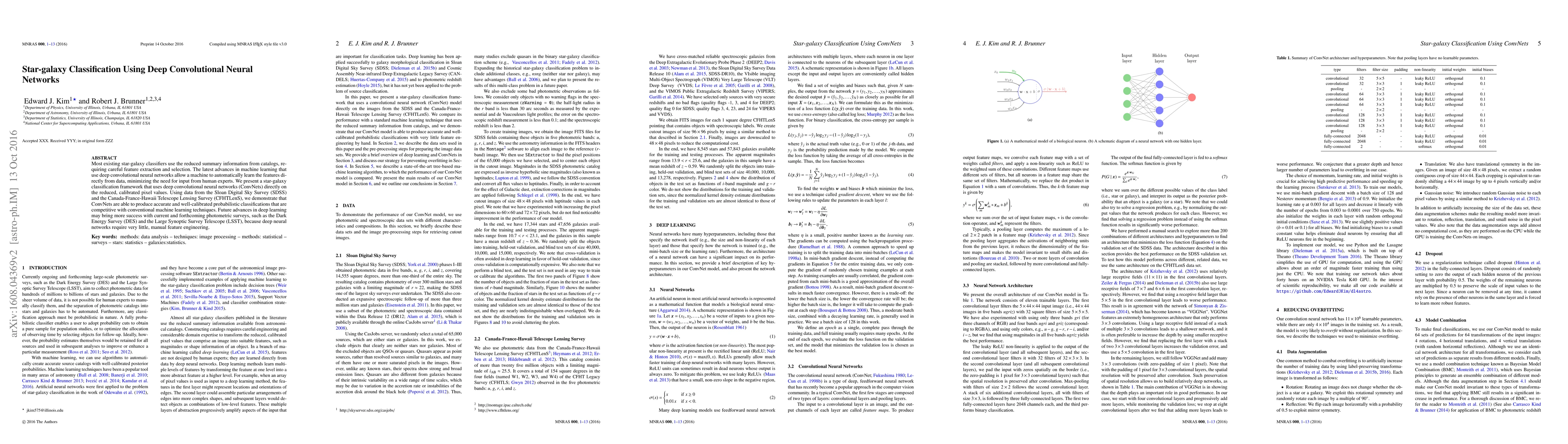 The research presents a star-galaxy classification framework using deep convolutional neural networks (ConvNets) directly on reduced, calibrated pixel values from the Sloan Digital Sky Survey (SDSS) and the Canada-France-Hawaii Telescope Lensing Survey (CFHTLenS). The ConvNets are trained using mini-batch gradient descent with Nesterov momentum and orthogonal initial weights.