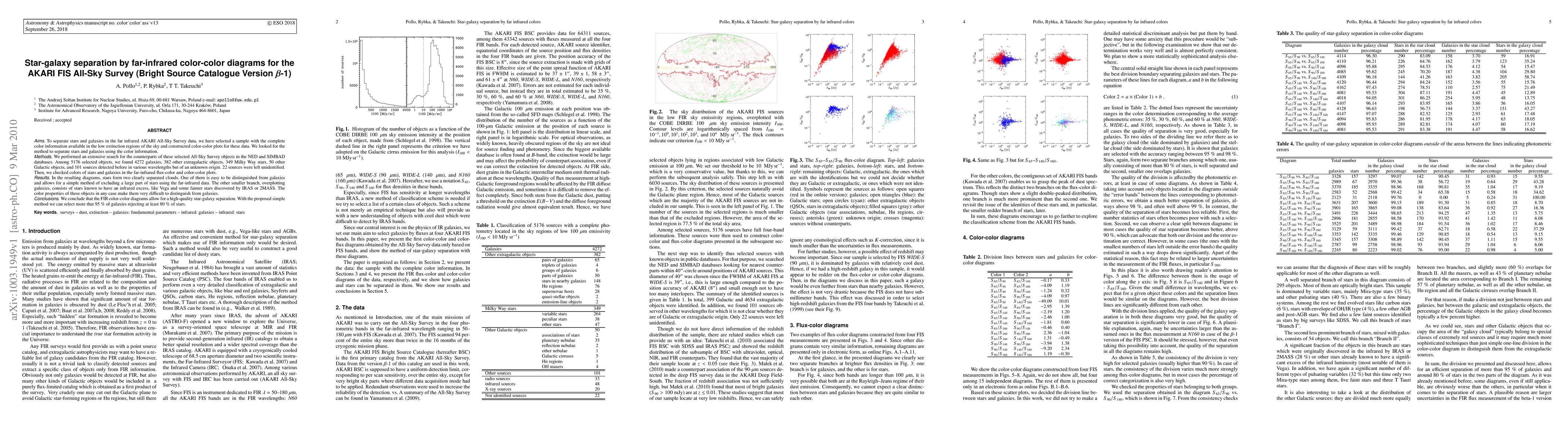 This paper presents a method for star-galaxy separation using far-infrared color-color diagrams from the AKARI FIS All-Sky Survey. The study identifies 4272 galaxies, 382 extragalactic objects, and 349 Milky Way stars among 5176 objects, demonstrating that FIR color-color plots allow for high-quality separation, enabling the selection of over 95% of galaxies while rejecting at least 80% of stars.