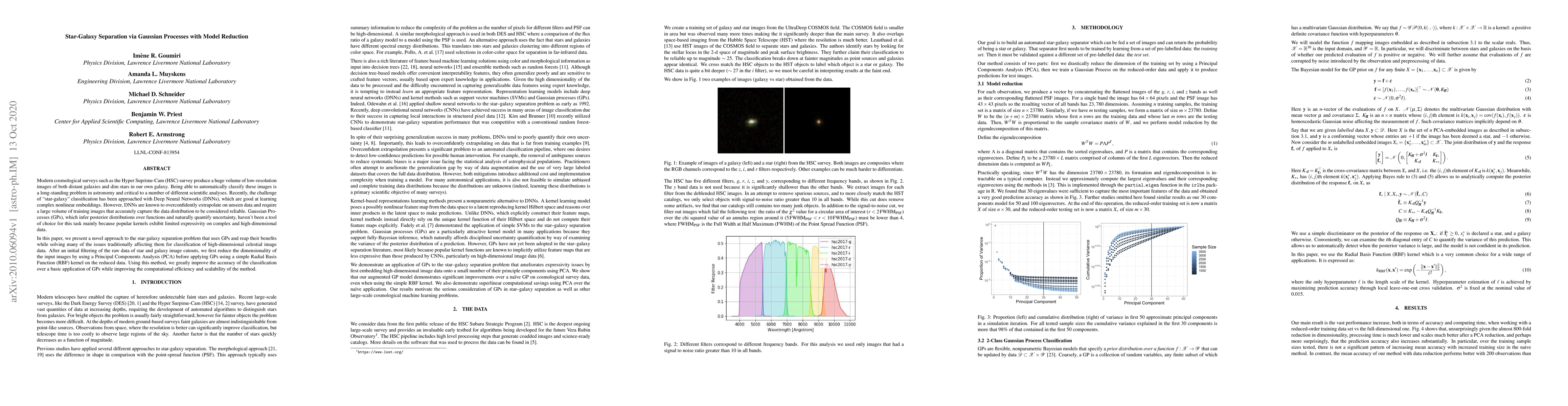 This paper proposes a novel method for star-galaxy separation using Gaussian Processes with model reduction, specifically employing PCA to reduce dimensionality before applying GPs with an RBF kernel. This approach enhances classification accuracy while improving computational efficiency and scalability compared to traditional GP methods.