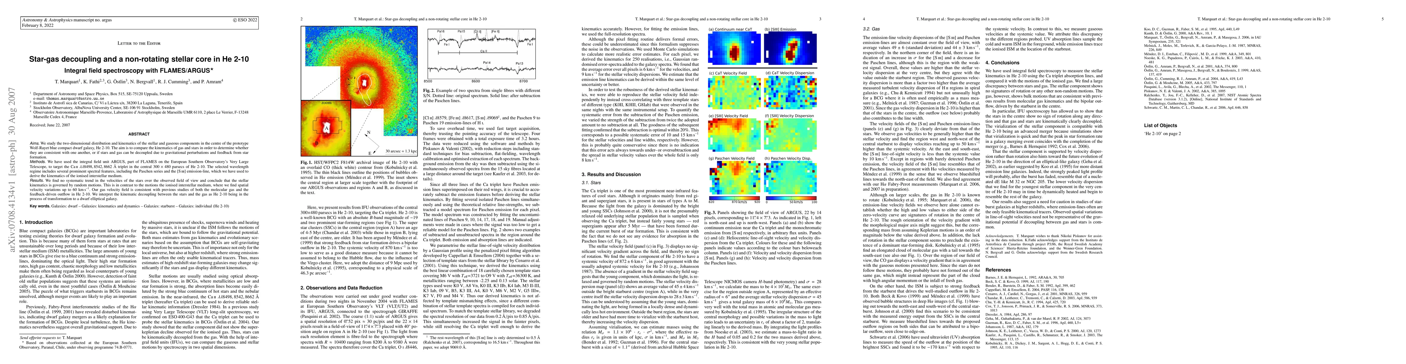 We study the two-dimensional distribution and kinematics of the stellar and gaseous components in the centre of the blue compact dwarf galaxy, He 2-10. The aim is to compare the kinematics of gas and stars in order to determine whether they are consistent with one another, or if stars and gas can be decoupled due to gravitational perturbations and feedback from star formation. We have used the integral field unit ARGUS, part of FLAMES on the European Southern Observatory's Very Large Telescope, to target the near-infrared Ca-triplet in the central 300 times 480 parsecs of He 2-10. The selected wavelength regime includes several prominent spectral features, including the Paschen series and an [SIII] emission-line, which we have used to derive the kinematics of the ionised interstellar medium. We find no systematic trend in the velocities of the stars over the observed field of view and conclude that the stellar kinematics is governed by random motions. This is in contrast to the motions the ionised interstellar medium, where we find spatial velocity variations up to 60 km/s. Our gas velocity field is consistent with previous studies of both the molecular gas and the feedback-driven outflow in He 2-10. We interpret the kinematic decoupling between the stars and the gas as He 2-10 being in the process of transformation to a dwarf elliptical galaxy.