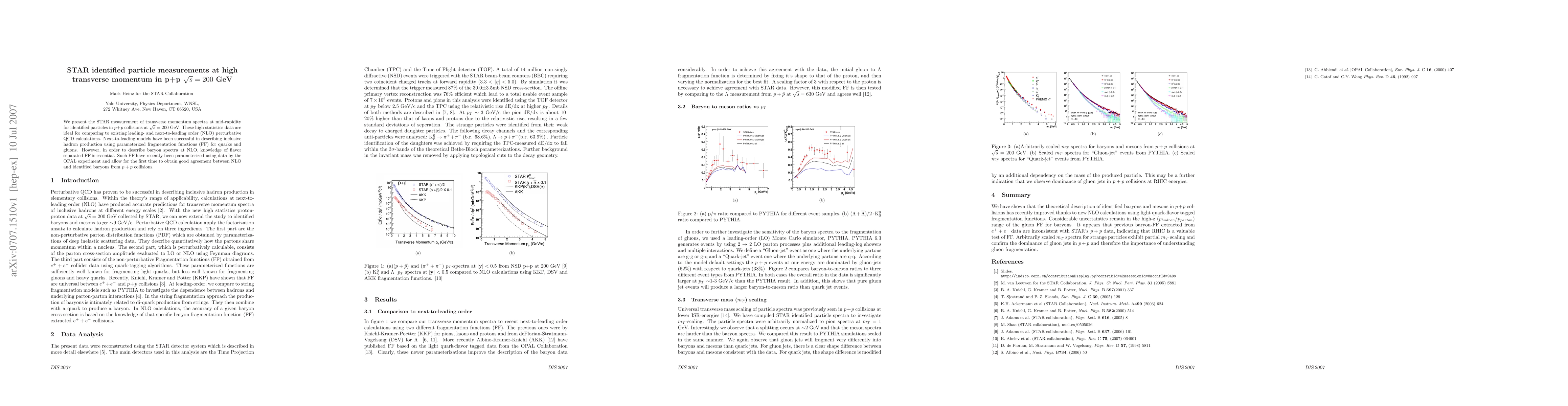 The STAR experiment reports high transverse momentum spectra for identified particles in p+p collisions at $\sqrt{s}$ = 200 GeV, providing data for comparison with NLO perturbative QCD calculations. These measurements enable the first good agreement between NLO theory and identified baryon spectra, facilitated by recent OPAL-parameterized flavor-separated fragmentation functions.