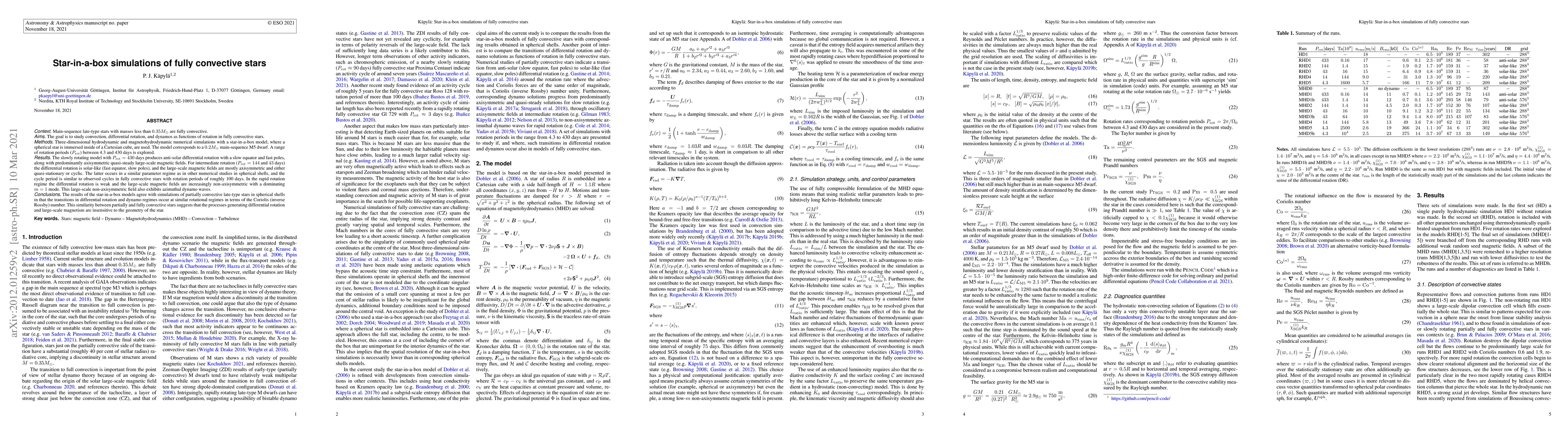 This paper investigates the behavior of convection, differential rotation, and magnetic fields in fully convective stars using star-in-a-box simulations. The study finds that slow rotation leads to anti-solar differential rotation and axisymmetric magnetic fields, while intermediate rotation produces solar-like differential rotation and cyclic magnetic fields, similar to observations. Rapid rotation results in weak differential rotation and non-axisymmetric magnetic fields. The findings suggest that the mechanisms behind these phenomena are geometry-independent.