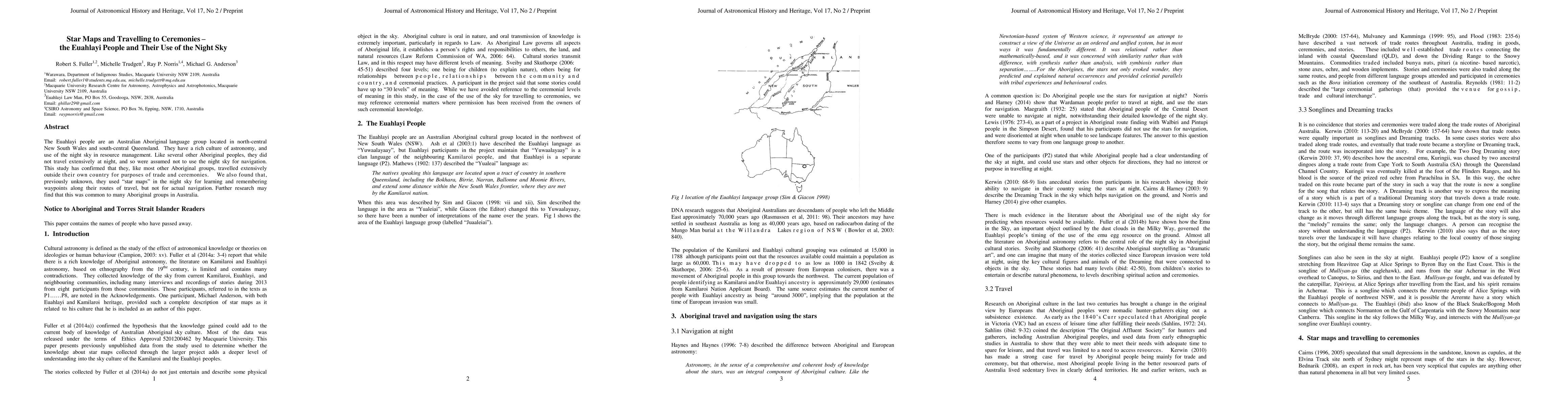 The Euahlayi people are an Australian Aboriginal language group located in north-central New South Wales and south-central Queensland. They have a rich culture of astronomy, and use of the night sky in resource management. Like several other Aboriginal peoples, they did not travel extensively at night, and so were assumed not to use the night sky for navigation. This study has confirmed that they, like most other Aboriginal groups, travelled extensively outside their own country for purposes of trade and ceremonies. We also found that, previously unknown, they used star maps in the night sky for learning and remembering waypoints along their routes of travel, but not for actual navigation. Further research may find that this was common to many Aboriginal groups in Australia.