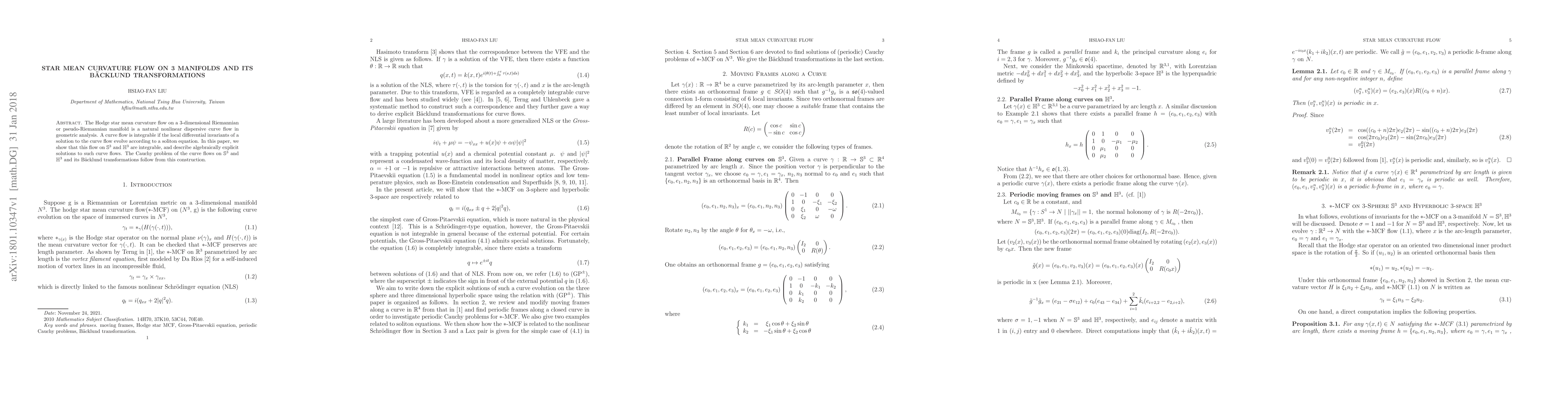 The Hodge star mean curvature flow on a 3-dimensional Riemannian or pseudo-Riemannian manifold is a natural nonlinear dispersive curve flow in geometric analysis. A curve flow is integrable if the local differential invariants of a solution to the curve flow evolve according to a soliton equation. In this paper, we show that this flow on $\mathbb{S}^3$ and $\mathbb{H}^3$ are integrable, and describe algebraically explicit solutions to such curve flows. The Cauchy problem of the curve flows on $\mathbb{S}^3$ and $\mathbb{H}^3$ and its B\"acklund transformations follow from this construction.