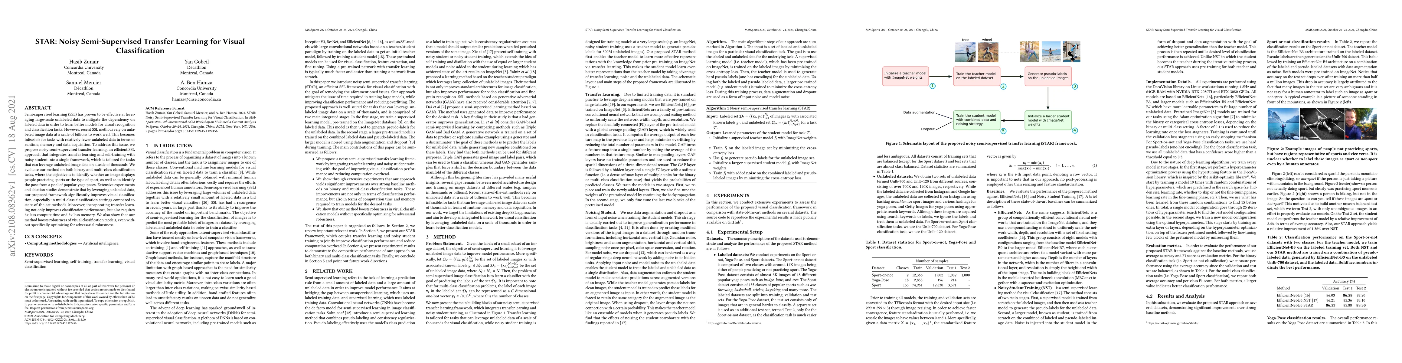 Semi-supervised learning (SSL) has proven to be effective at leveraging large-scale unlabeled data to mitigate the dependency on labeled data in order to learn better models for visual recognition and classification tasks. However, recent SSL methods rely on unlabeled image data at a scale of billions to work well. This becomes infeasible for tasks with relatively fewer unlabeled data in terms of runtime, memory and data acquisition. To address this issue, we propose noisy semi-supervised transfer learning, an efficient SSL approach that integrates transfer learning and self-training with noisy student into a single framework, which is tailored for tasks that can leverage unlabeled image data on a scale of thousands. We evaluate our method on both binary and multi-class classification tasks, where the objective is to identify whether an image displays people practicing sports or the type of sport, as well as to identify the pose from a pool of popular yoga poses. Extensive experiments and ablation studies demonstrate that by leveraging unlabeled data, our proposed framework significantly improves visual classification, especially in multi-class classification settings compared to state-of-the-art methods. Moreover, incorporating transfer learning not only improves classification performance, but also requires 6x less compute time and 5x less memory. We also show that our method boosts robustness of visual classification models, even without specifically optimizing for adversarial robustness.