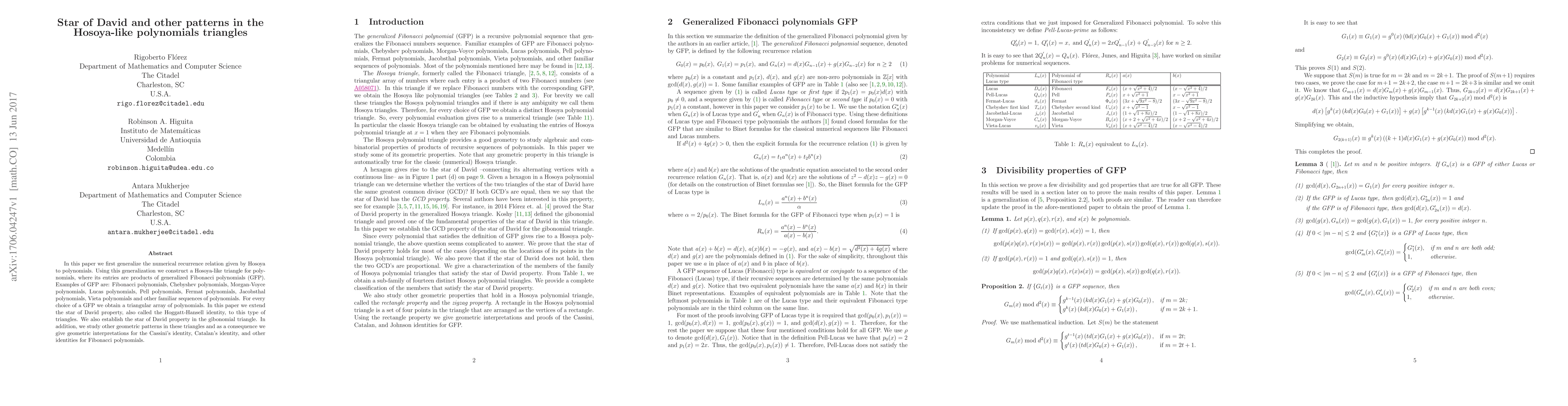 In this paper we first generalize the numerical recurrence relation given by Hosoya to polynomials. Using this generalization we construct a Hosoya-like triangle for polynomials, where its entries are products of generalized Fibonacci polynomials (GFP). Examples of GFP are: Fibonacci polynomials, Chebyshev polynomials, Morgan-Voyce polynomials, Lucas polynomials, Pell polynomials, Fermat polynomials, Jacobsthal polynomials, Vieta polynomials and other familiar sequences of polynomials. For every choice of a GFP we obtain a triangular array of polynomials. In this paper we extend the star of David property, also called the Hoggatt-Hansell identity, to this type of triangles. We also establish the star of David property in the gibonomial triangle. In addition, we study other geometric patterns in these triangles and as a consequence we give geometric interpretations for the Cassini's identity, Catalan's identity, and other identities for Fibonacci polynomials.