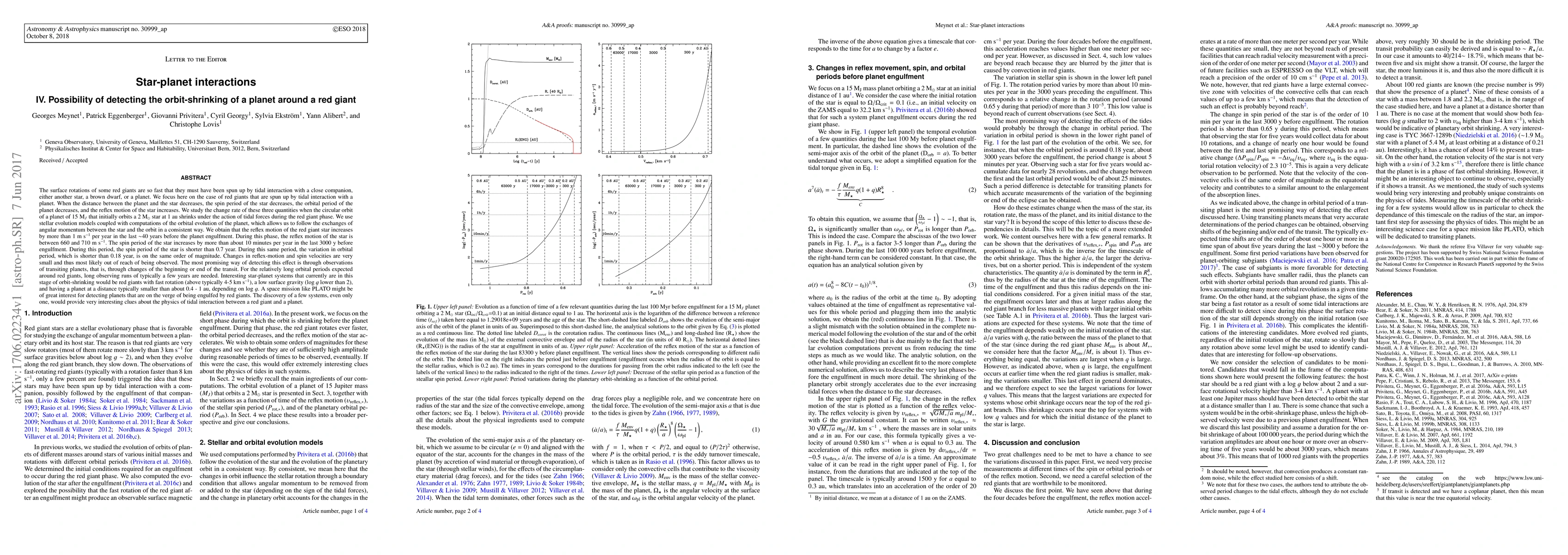 This paper investigates the tidal interactions between red giants and close-in planets, focusing on the orbit-shrinking process. The study finds that the reflex motion of the star increases significantly, potentially detectable via transit timing variations, suggesting that missions like PLATO could identify planets nearing engulfment.