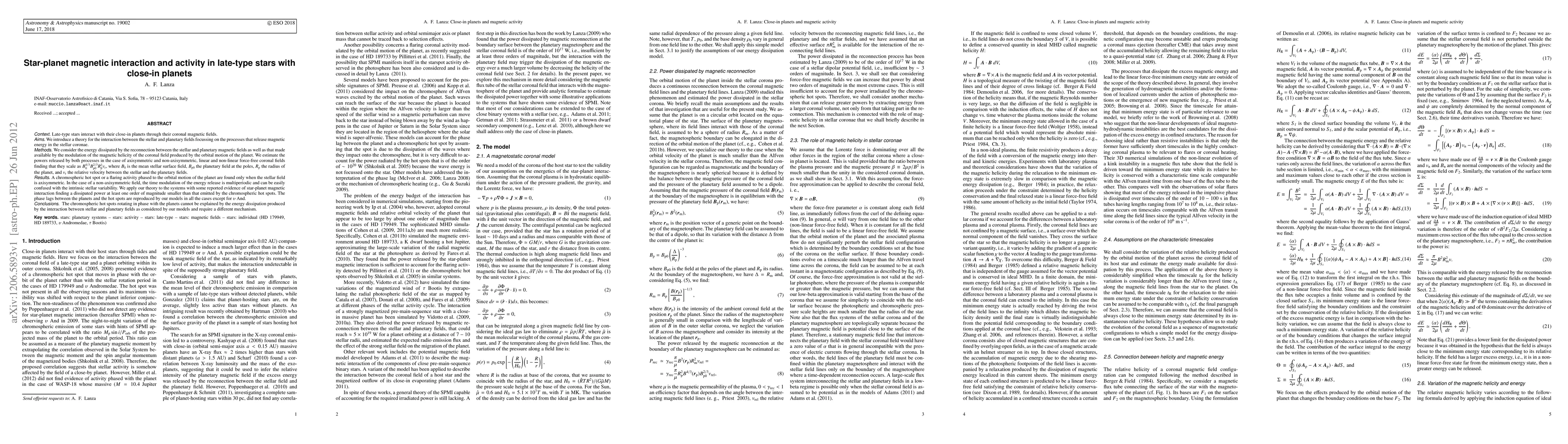 Late-type stars interact with their close-in planets through their coronal magnetic fields. We introduce a theory for the interaction between the stellar and planetary fields focussing on the processes that release magnetic energy in the stellar coronae. We consider the energy dissipated by the reconnection between the stellar and planetary magnetic fields as well as that made available by the modulation of the magnetic helicity of the coronal field produced by the orbital motion of the planet. We estimate the powers released by both processes in the case of axisymmetric and non-axisymmetric, linear and non-linear force-free coronal fields finding that they scale as v_r (B_s)^(4/3) (B_p)^(2/3) (R_p)^2, where v_r is the relative velocity between the stellar and planetary fields, B_s the mean stellar surface field, B_p the planetary field at the poles, and R_p the radius of the planet. A chromospheric hot spot or a flaring activity phased to the orbital motion of the planet are found only when the stellar field is axisymmetric. In the case of a non-axisymmetric field, the time modulation of the energy release is multiperiodic and can be easily confused with the intrinsic stellar variability. We apply our theory to the systems with some reported evidence of star-planet magnetic interaction finding a dissipated power at least one order of magnitude smaller than that emitted by the chromospheric hot spots. The phase lags between the planets and the hot spots are reproduced by our models in all the cases except for upsilon And. In conclusion, the chromospheric hot spots rotating in phase with the planets cannot be explained by the energy dissipation produced by the interaction between stellar and planetary fields as considered by our models and require a different mechanism.