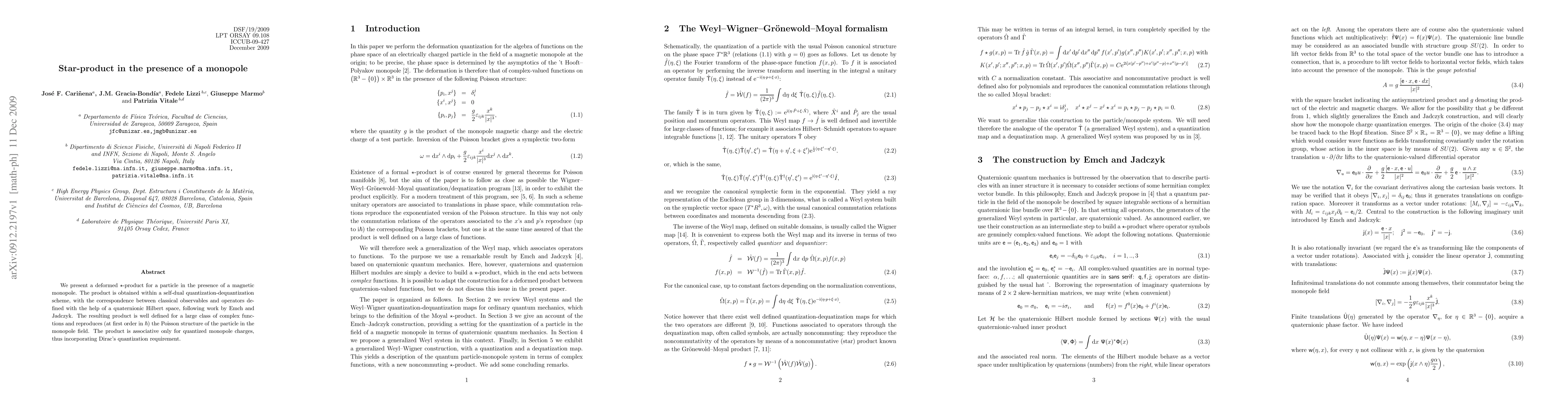 We present a deformed star-product for a particle in the presence of a magnetic monopole. The product is obtained within a self-dual quantization-dequantization scheme, with the correspondence between classical observables and operators defined with the help of a quaternionic Hilbert space, following work by Emch and Jadczyk. The resulting product is well defined for a large class of complex functions and reproduces (at first order in hbar) the Poisson structure of the particle in the monopole field. The product is associative only for quantized monopole charges, thus incorporating Dirac's quantization requirement.