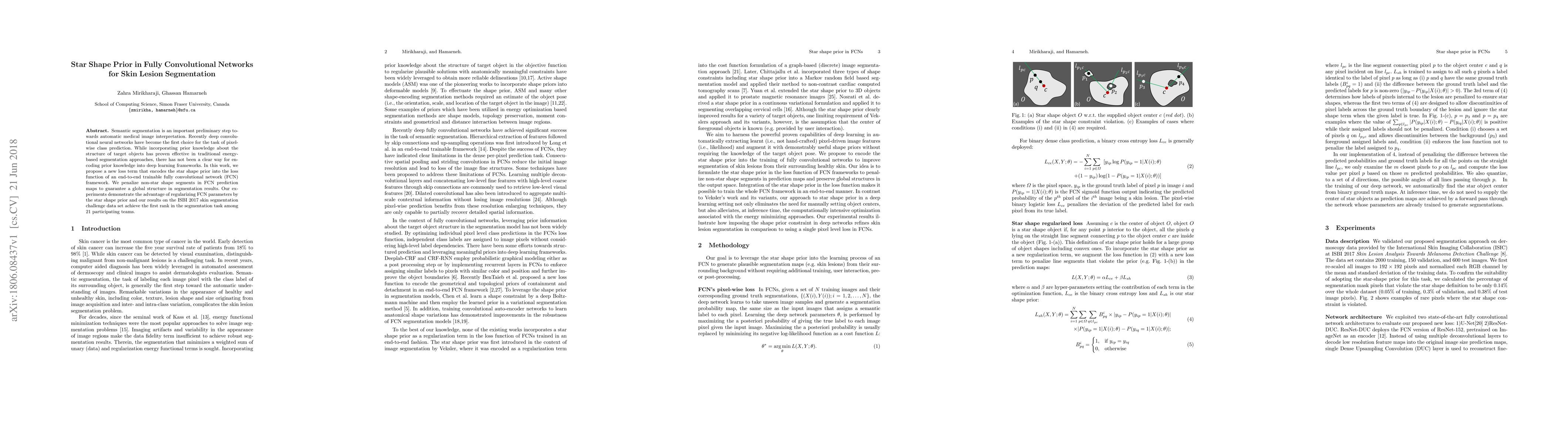 This paper proposes a new loss term incorporating a star shape prior into a fully convolutional network (FCN) for skin lesion segmentation, achieving first rank in the ISBI 2017 skin segmentation challenge by penalizing non-star shape segments to ensure global structural consistency in the segmentation results.