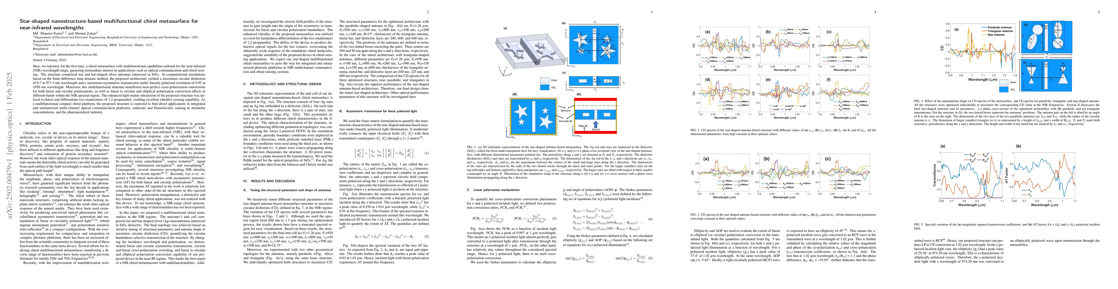 The design and simulation of a star-shaped nanostructure-based multifunctional chiral metasurface for near-infrared wavelengths, showcasing high circular dichroism and asymmetric transmission.