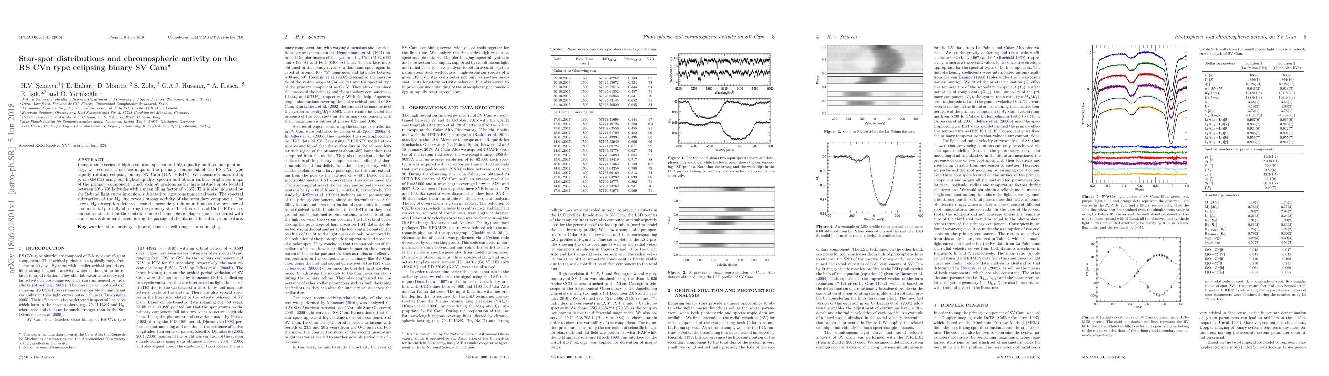 This study reconstructs the surface maps of the primary star in the RS CVn binary SV Cam, revealing high-latitude star-spots with a filling factor of about 35%. The analysis also indicates strong chromospheric activity in the secondary component and suggests the presence of cool material near the primary star.