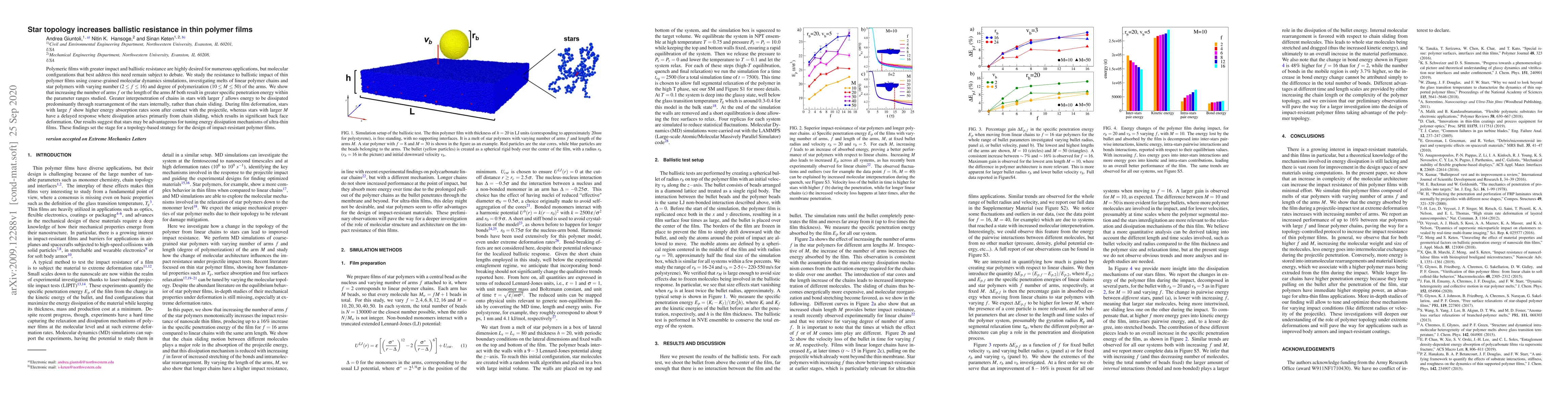 This study demonstrates that star polymers enhance ballistic resistance in thin polymer films by increasing specific penetration energy through internal rearrangement and chain sliding mechanisms. The results suggest star topology is a promising approach for designing impact-resistant polymer films.