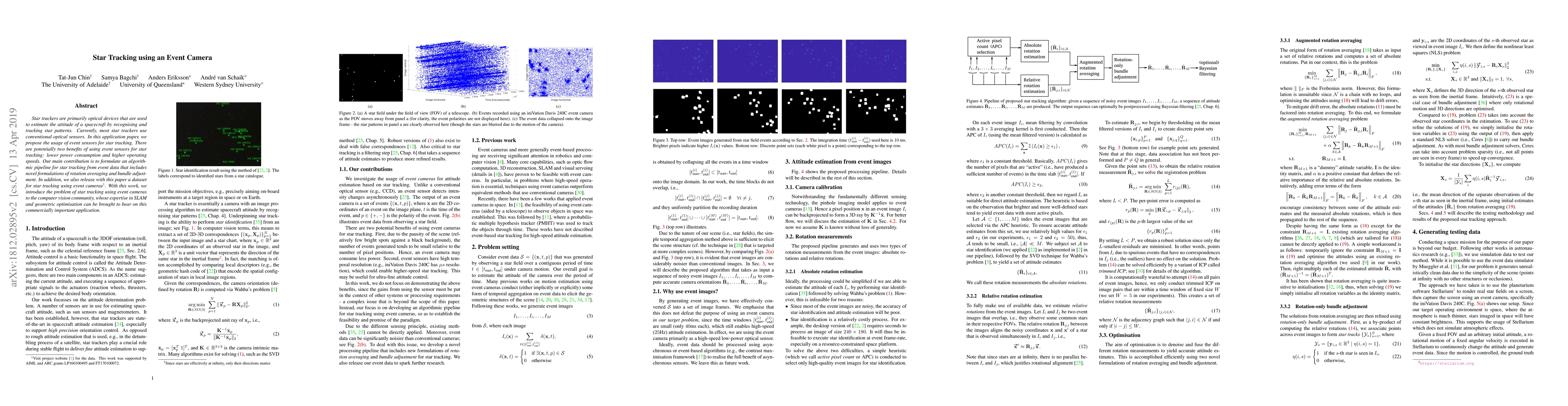 Researchers propose using event cameras for star tracking due to lower power consumption and higher speeds, introducing a new algorithmic pipeline that combines rotation averaging and bundle adjustment for accurate attitude estimation.