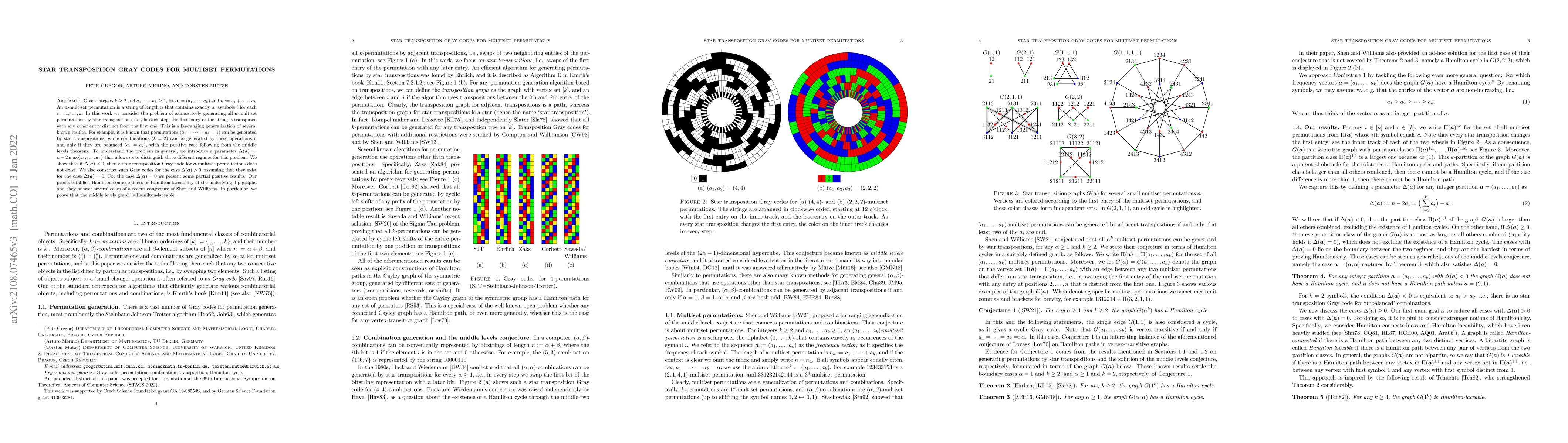 Given integers $k\geq 2$ and $a_1,\ldots,a_k\geq 1$, let $\boldsymbol{a}:=(a_1,\ldots,a_k)$ and $n:=a_1+\cdots+a_k$. An $\boldsymbol{a}$-multiset permutation is a string of length $n$ that contains exactly $a_i$ symbols $i$ for each $i=1,\ldots,k$. In this work we consider the problem of exhaustively generating all $\boldsymbol{a}$-multiset permutations by star transpositions, i.e., in each step, the first entry of the string is transposed with any other entry distinct from the first one. This is a far-ranging generalization of several known results. For example, it is known that permutations ($a_1=\cdots=a_k=1$) can be generated by star transpositions, while combinations ($k=2$) can be generated by these operations if and only if they are balanced ($a_1=a_2$), with the positive case following from the middle levels theorem. To understand the problem in general, we introduce a parameter $\Delta(\boldsymbol{a}):=n-2\max\{a_1,\ldots,a_k\}$ that allows us to distinguish three different regimes for this problem. We show that if $\Delta(\boldsymbol{a})<0$, then a star transposition Gray code for $\boldsymbol{a}$-multiset permutations does not exist. We also construct such Gray codes for the case $\Delta(\boldsymbol{a})>0$, assuming that they exist for the case $\Delta(\boldsymbol{a})=0$. For the case $\Delta(\boldsymbol{a})=0$ we present some partial positive results. Our proofs establish Hamilton-connectedness or Hamilton-laceability of the underlying flip graphs, and they answer several cases of a recent conjecture of Shen and Williams. In particular, we prove that the middle levels graph is Hamilton-laceable.