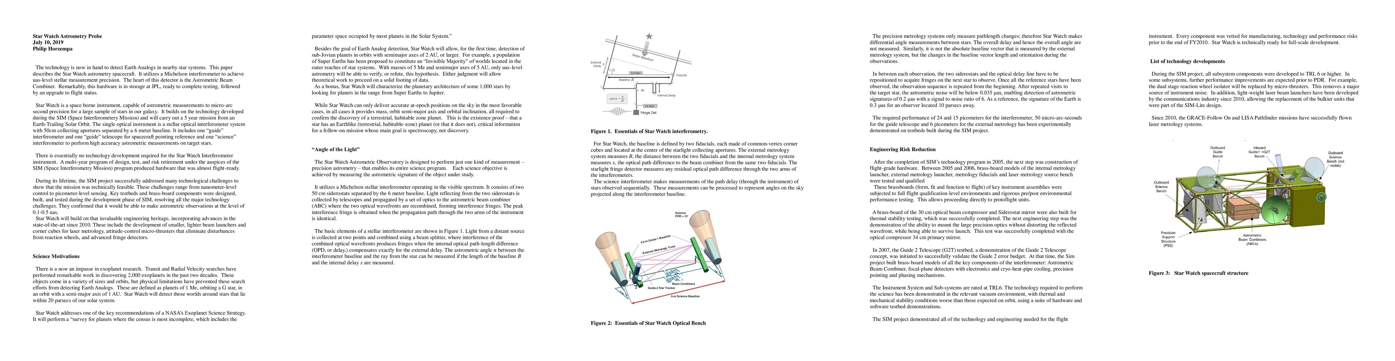 The Star Watch extreme-precision astrometry mission (0.1 - 1.0 uas) builds on technology developed, and validated, during the SIM (Space Interferometry Mission) project. The sole science instrument is an optical interferometer with 50-cm collecting apertures, separated by a 6-meter baseline. The heart of this detector is the Astrometric Beam Combiner (ABC). This is flight-quality hardware that underwent testing at high levels of integration, retiring most technical risk (achieving TRL-6) after 10 years and $600 million of investment. The ABC is in storage at JPL, ready to complete testing, followed by integration with the mission support structure. Star Watch incorporates advances in technology since the end of the SIM project. These include smaller, lighter beam launchers and corner cubes for laser metrology; attitude-control micro-thrusters, allowing deletion of reaction wheels; and advanced fringe detectors. The technology pioneered by Star Watch, the first long-baseline Michelson interferometer in space, represents an important investment in the future of space astronomy. NASA's proposed Vision Missions (Exo-Earth, Black Hole and Cosmic Dawn Mappers) require the use of precision interferometers. No other Astrophysics Probe concept comes close to this level of technical readiness. There are no analogs to Star Watch. It will provide access, for the first time, to the realm of temperate Terrestrial worlds circling nearby sun-like stars, measuring true masses and orbits. This can be achieved by the close of the 2020s.