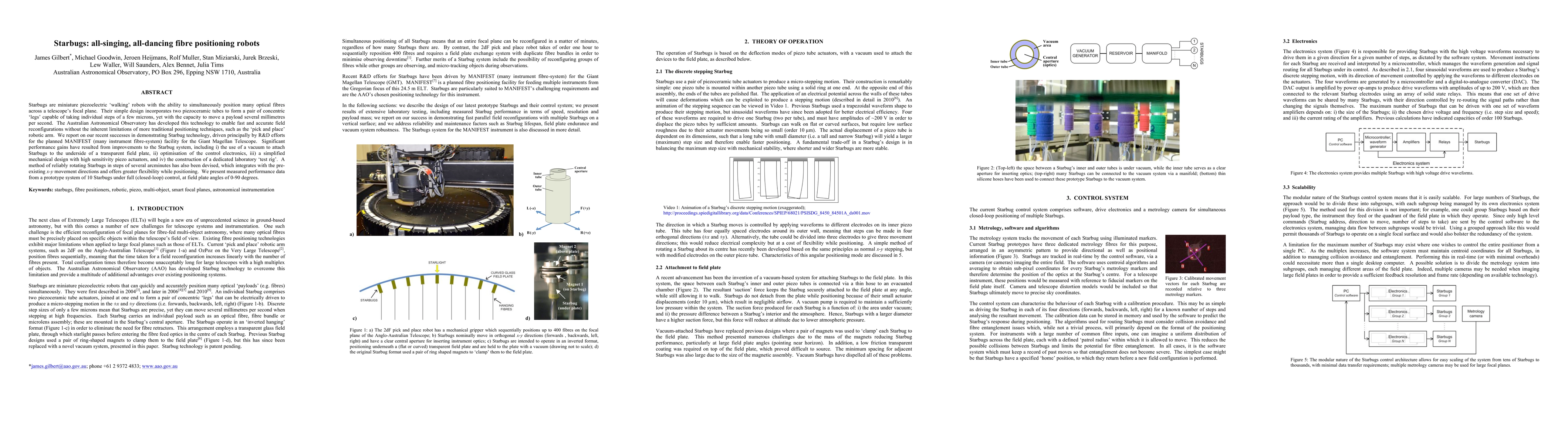 The Starbugs are innovative piezoelectric robots designed to position optical fibres on a telescope's focal plane with high precision and speed. Recent advancements include vacuum attachment, optimised electronics, and a simplified mechanical design, enabling significant performance improvements and greater flexibility in fibre positioning.