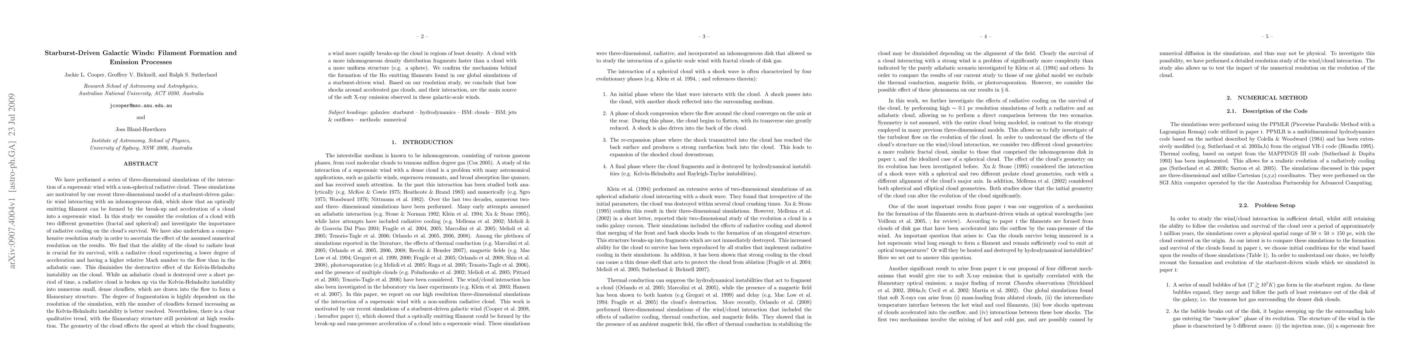 This study investigates the formation of filaments in starburst-driven galactic winds through 3D simulations of cloud interactions with supersonic winds. Radiative cooling is found crucial for cloud survival, leading to filament formation via Kelvin-Helmholtz instability, with fragmentation degree highly dependent on simulation resolution. The research confirms the mechanism behind H-alpha emitting filaments and identifies bow shocks as the main source of soft X-ray emissions.