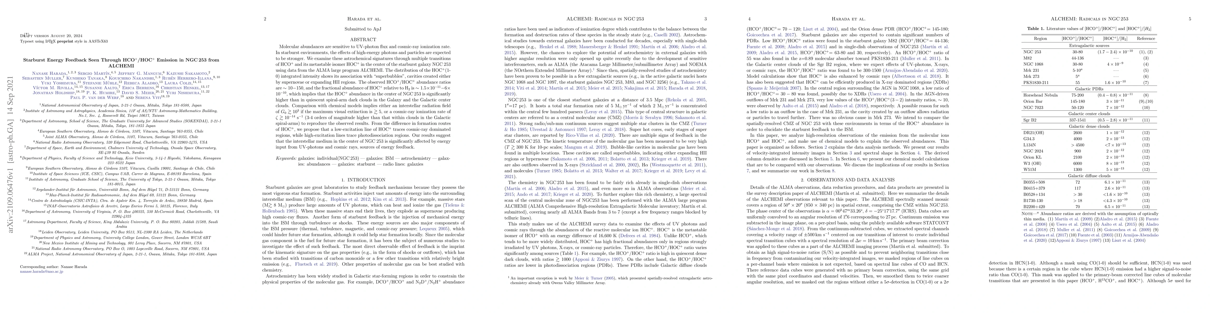 This study uses ALMA data from ALCHEMI to analyze HCO$^+$ and HOC$^+$ emissions in NGC 253, revealing that the HOC$^+$ abundance is significantly higher than in quiescent regions, suggesting strong energy feedback from UV photons and cosmic rays in the starburst environment. The findings suggest different formation routes for HOC$^+$ trace different regions influenced by cosmic rays or photodissociation.