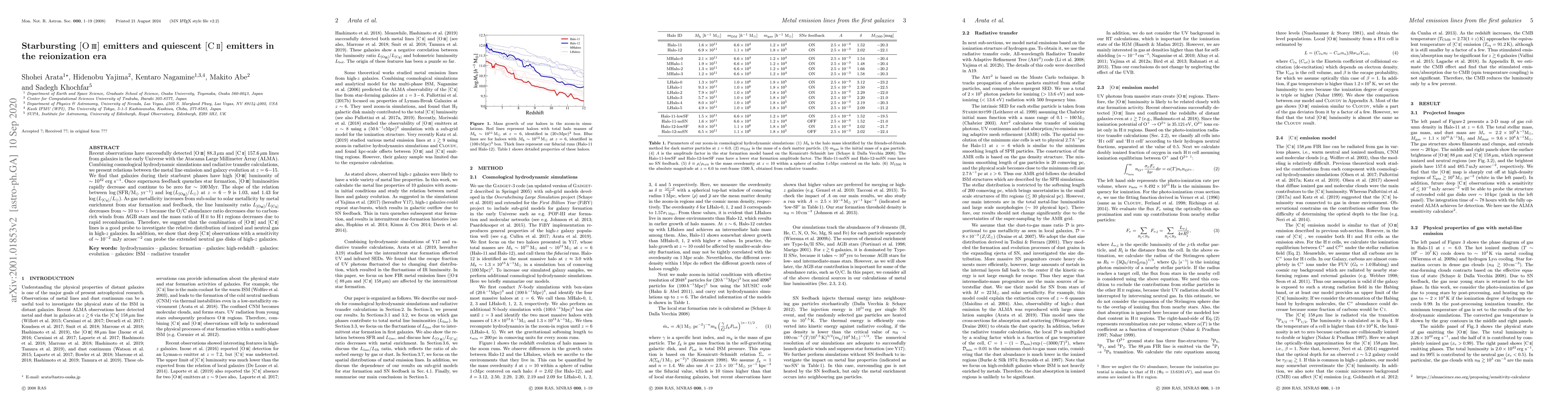 This paper investigates the [O III] and [C II] line emissions in galaxies from the reionization era ($z=6-15$) using ALMA observations and simulations. It finds that starburst galaxies exhibit high [O III] luminosity, which drops significantly after star formation quenches. The study suggests that [O III] and [C II] lines can probe ionized and neutral gas distributions, and deep [C II] observations can reveal extended neutral gas disks in high-$z$ galaxies.