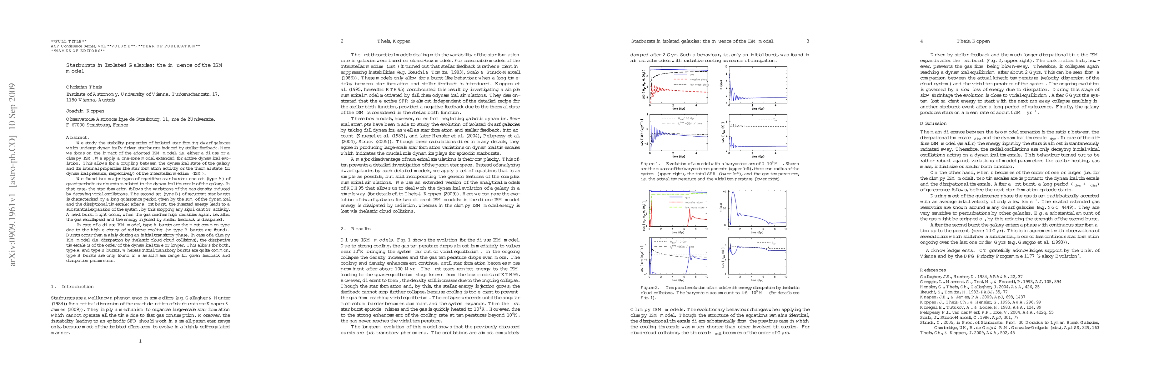 This paper investigates the stability properties of isolated star-forming dwarf galaxies experiencing starbursts driven by stellar feedback. It finds two types of starbursts: type A, quasi-periodic and related to the galaxy's dynamical timescale, and type B, characterized by long quiescent periods. The study reveals that a diffuse ISM model predominantly leads to type A bursts due to efficient radiative cooling, while a clumpy ISM model allows for both types of bursts due to longer dissipative timescales.