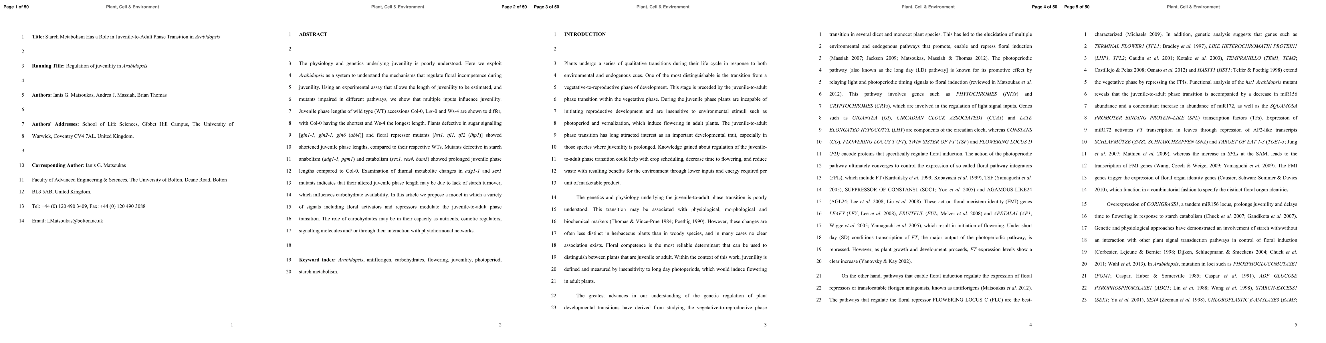 This research investigates the mechanisms regulating juvenility in Arabidopsis, revealing that starch metabolism and antiflorigenic signals influence the juvenile-to-adult phase transition. Mutants with altered starch metabolism show prolonged juvenility, suggesting that starch turnover impacts carbohydrate availability and phase transition timing.