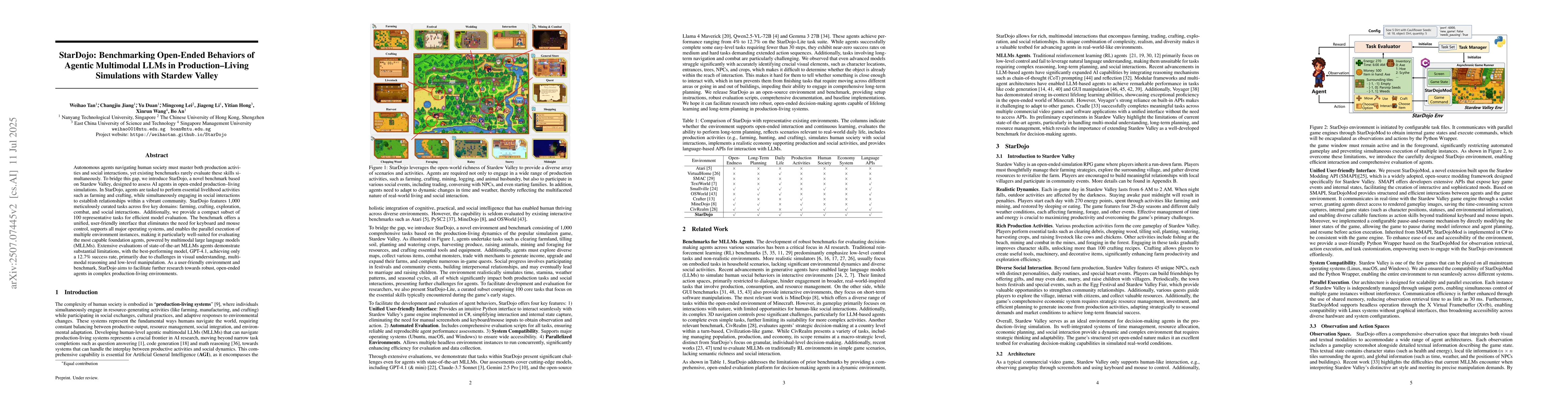 Autonomous agents navigating human society must master both production activities and social interactions, yet existing benchmarks rarely evaluate these skills simultaneously. To bridge this gap, we introduce StarDojo, a novel benchmark based on Stardew Valley, designed to assess AI agents in open-ended production-living simulations. In StarDojo, agents are tasked to perform essential livelihood activities such as farming and crafting, while simultaneously engaging in social interactions to establish relationships within a vibrant community. StarDojo features 1,000 meticulously curated tasks across five key domains: farming, crafting, exploration, combat, and social interactions. Additionally, we provide a compact subset of 100 representative tasks for efficient model evaluation. The benchmark offers a unified, user-friendly interface that eliminates the need for keyboard and mouse control, supports all major operating systems, and enables the parallel execution of multiple environment instances, making it particularly well-suited for evaluating the most capable foundation agents, powered by multimodal large language models (MLLMs). Extensive evaluations of state-of-the-art MLLMs agents demonstrate substantial limitations, with the best-performing model, GPT-4.1, achieving only a 12.7% success rate, primarily due to challenges in visual understanding, multimodal reasoning and low-level manipulation. As a user-friendly environment and benchmark, StarDojo aims to facilitate further research towards robust, open-ended agents in complex production-living environments.