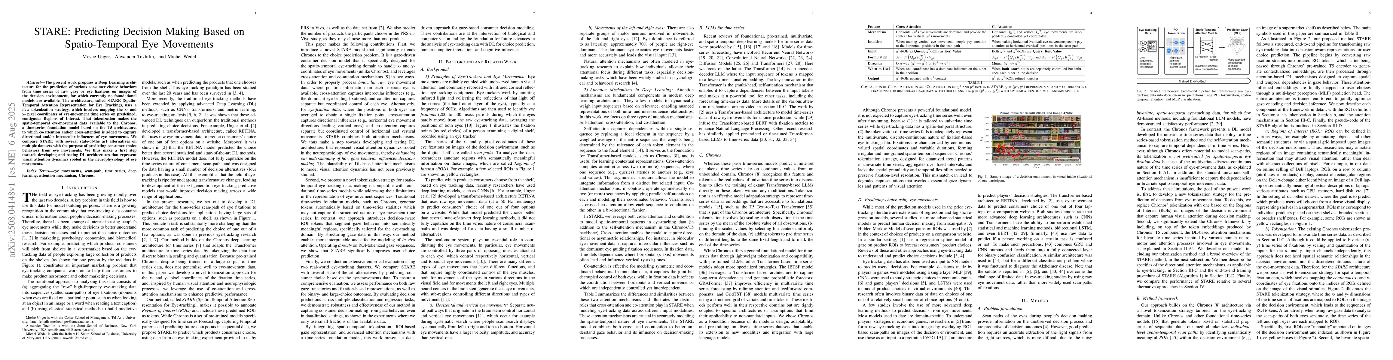 The present work proposes a Deep Learning architecture for the prediction of various consumer choice behaviors from time series of raw gaze or eye fixations on images of the decision environment, for which currently no foundational models are available. The architecture, called STARE (Spatio-Temporal Attention Representation for Eye Tracking), uses a new tokenization strategy, which involves mapping the x- and y- pixel coordinates of eye-movement time series on predefined, contiguous Regions of Interest. That tokenization makes the spatio-temporal eye-movement data available to the Chronos, a time-series foundation model based on the T5 architecture, to which co-attention and/or cross-attention is added to capture directional and/or interocular influences of eye movements. We compare STARE with several state-of-the art alternatives on multiple datasets with the purpose of predicting consumer choice behaviors from eye movements. We thus make a first step towards developing and testing DL architectures that represent visual attention dynamics rooted in the neurophysiology of eye movements.
