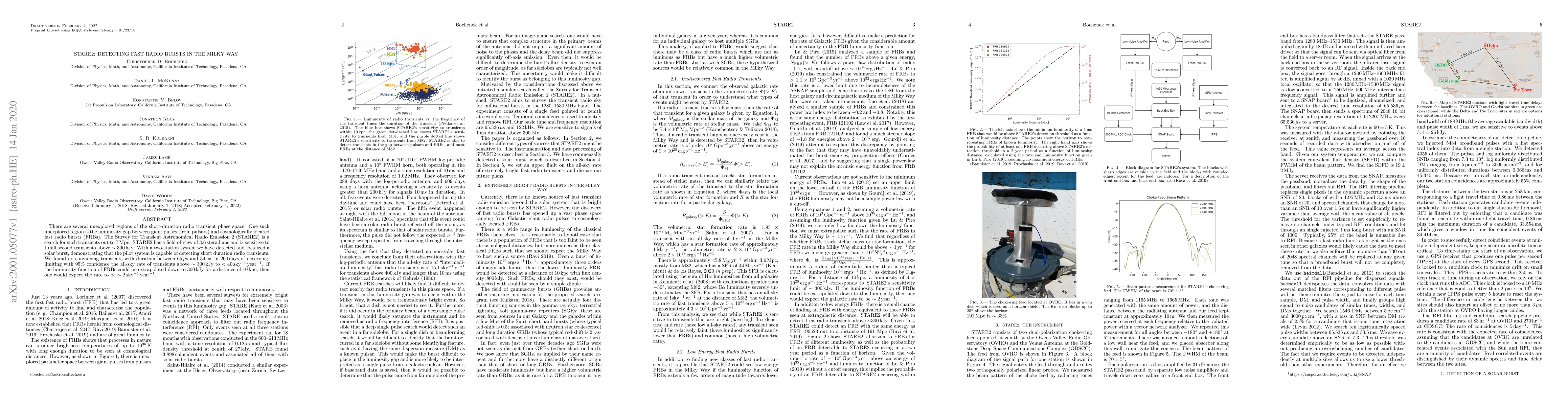 STARE2 is a two-station system designed to detect fast radio bursts (FRBs) in the Milky Way within 7 Mpc, sensitive to one-millisecond transients above ~300 kJy. It uses a log-periodic antenna and a horn antenna, operating in the 1170–1740 MHz band with a time resolution of 10 ms and frequency resolution of 1.02 MHz.