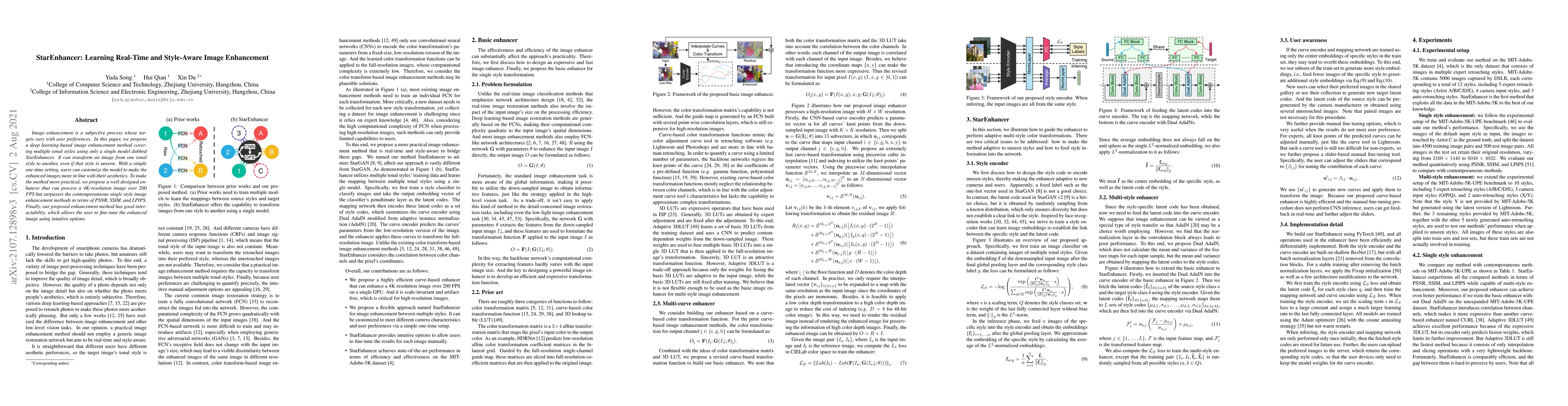 StarEnhancer is a deep learning model for real-time, style-aware image enhancement that can adapt to unseen tonal styles and is customizable to user preferences. It achieves high performance in processing 4K images at over 200 FPS and offers intuitive fine-tuning options for enhanced interactivity.