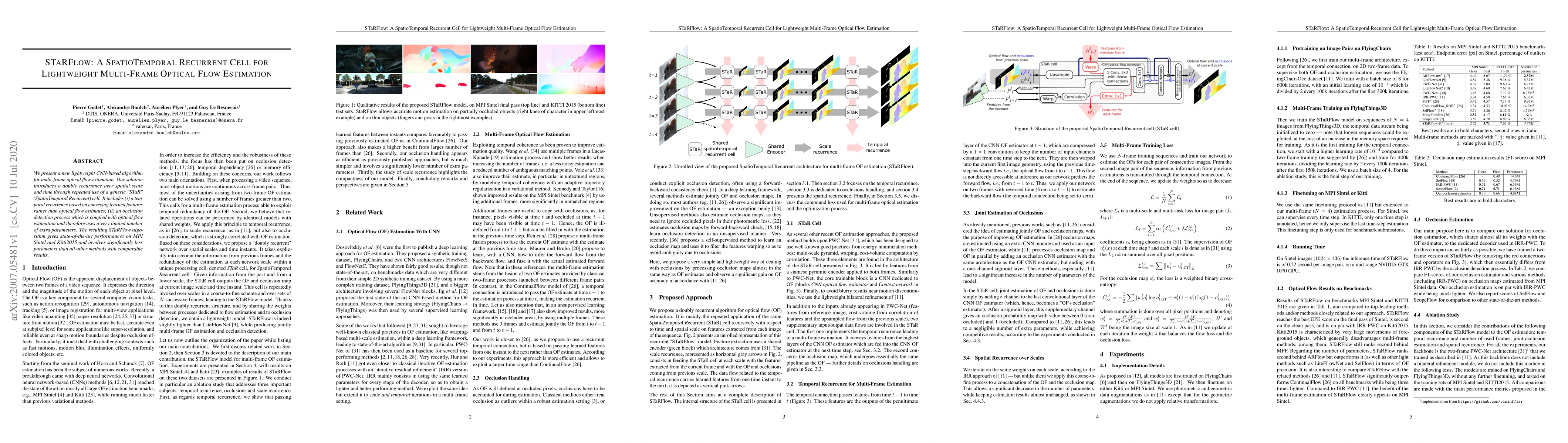 The STaRFlow algorithm introduces a lightweight CNN-based approach for multi-frame optical flow estimation using a novel "STaR" cell with double recurrence over spatial and temporal scales, achieving state-of-the-art performance with fewer parameters than other methods. It also incorporates an efficient occlusion detection process.