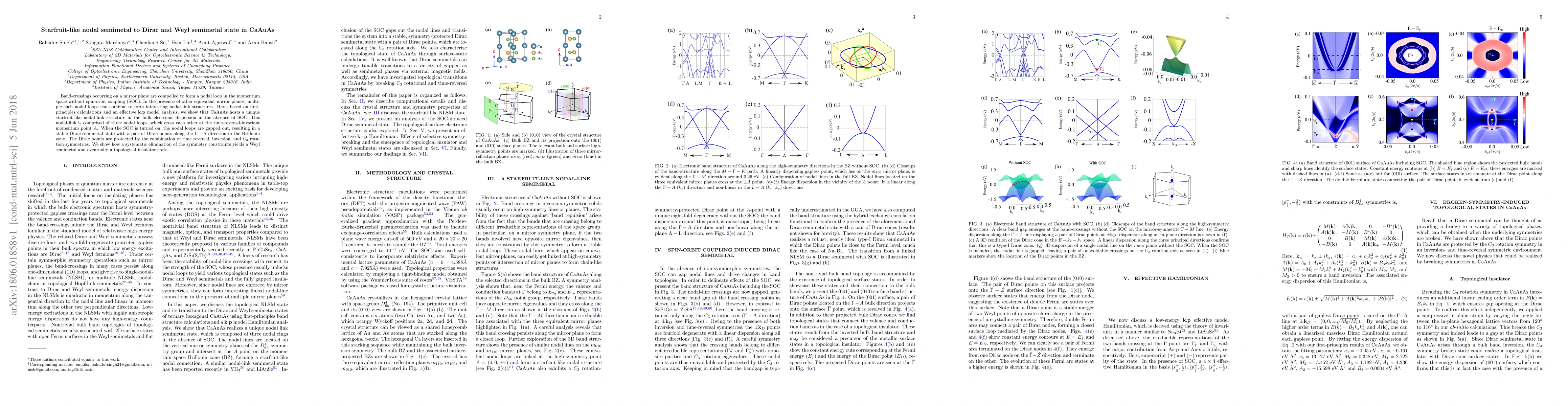 CaAuAs features a unique starfruit-like nodal-link structure without spin-orbit coupling, transitioning to a stable Dirac semimetal with protected Dirac points upon introducing spin-orbit coupling. Removing symmetry constraints further leads to a Weyl semimetal or topological insulator state.
