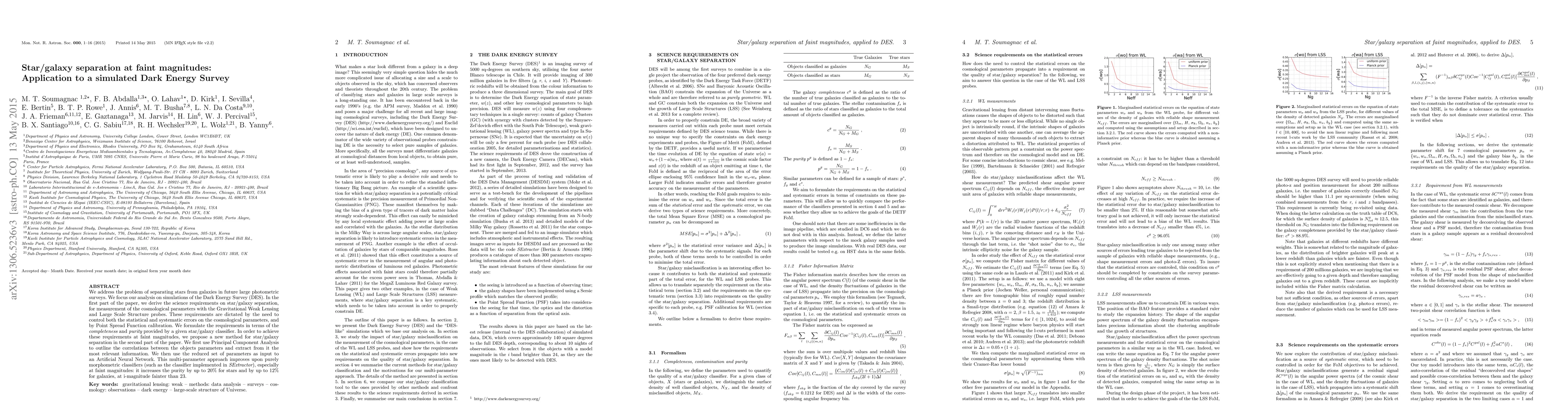 We address the problem of separating stars from galaxies in future large photometric surveys. We focus our analysis on simulations of the Dark Energy Survey (DES). In the first part of the paper, we derive the science requirements on star/galaxy separation, for measurement of the cosmological parameters with the Gravitational Weak Lensing and Large Scale Structure probes. These requirements are dictated by the need to control both the statistical and systematic errors on the cosmological parameters, and by Point Spread Function calibration. We formulate the requirements in terms of the completeness and purity provided by a given star/galaxy classifier. In order to achieve these requirements at faint magnitudes, we propose a new method for star/galaxy separation in the second part of the paper. We first use Principal Component Analysis to outline the correlations between the objects parameters and extract from it the most relevant information. We then use the reduced set of parameters as input to an Artificial Neural Network. This multi-parameter approach improves upon purely morphometric classifiers (such as the classifier implemented in SExtractor), especially at faint magnitudes: it increases the purity by up to 20% for stars and by up to 12% for galaxies, at i-magnitude fainter than 23.